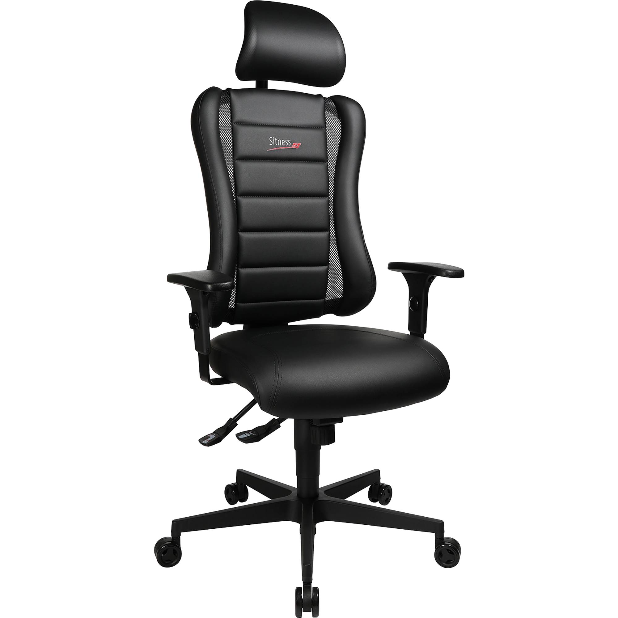 Moderner "Gaming Chair" mit Kopfstütze unter ergonomischen Aspekten konzipiert für lange Sitzzeiten. Stufenlose Sitzhöhenverstellung mit Toplift. Rückenlehne mit Netz/Polsterkombination für optimale Rückenunterstützung und höchsten Sitzkomfort, in der Höhe über Rastermechanik verstellbar. Hohe, konturgeformte Rückenlehne mit seitlicher Führung für entspanntes Sitzen. Großer Sitz für höchsten Sitzkomfort mit Sitness-Gelenk für dreidimensionale Beweglichkeit der Sitzfläche. Synchronmechanik, zur synchronen Verstellung von Sitz- und Rückenlehnenneigung, Federkraft individuell auf das Körpergewicht einstellbar, stufenlos arretierbar. Großes, standsicheres Fußkreuz, ausgerüstet mit lastabhängig gebremsten und modernen Sicherheitsdoppelrollen im Speichen-Design.