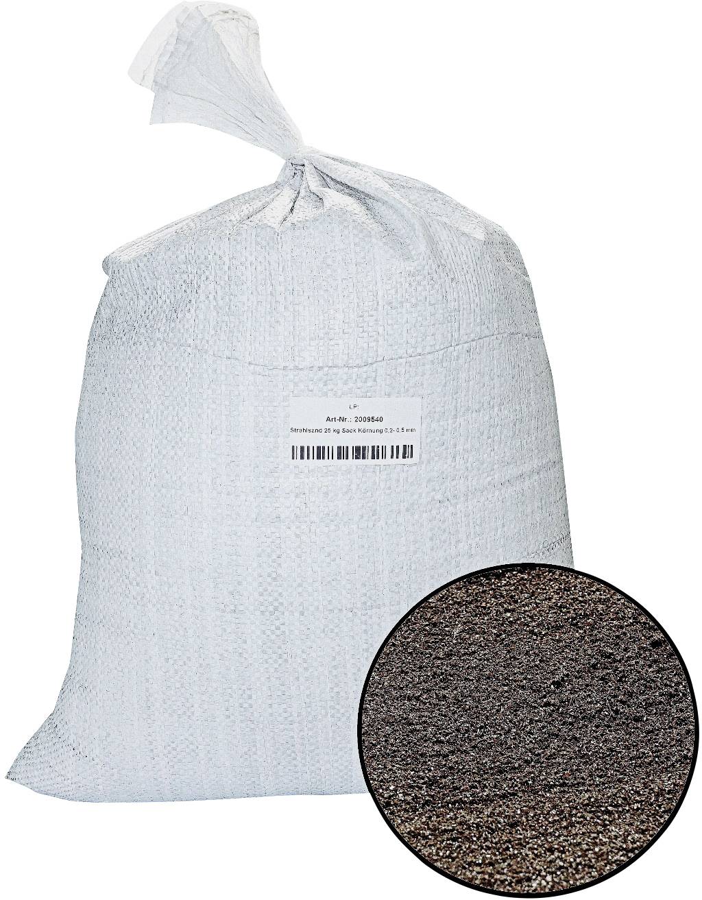 Strahlsand für jede Sandstrahlpistole geeignet · Strahlsand für Anlagen aller Art · Inhalt: 25 kg · Körnung: 0,2 - 0,5 mm · Hochofenschlacke · Silikatfrei · Zum Reinigen, Schleifen und Entroste.
