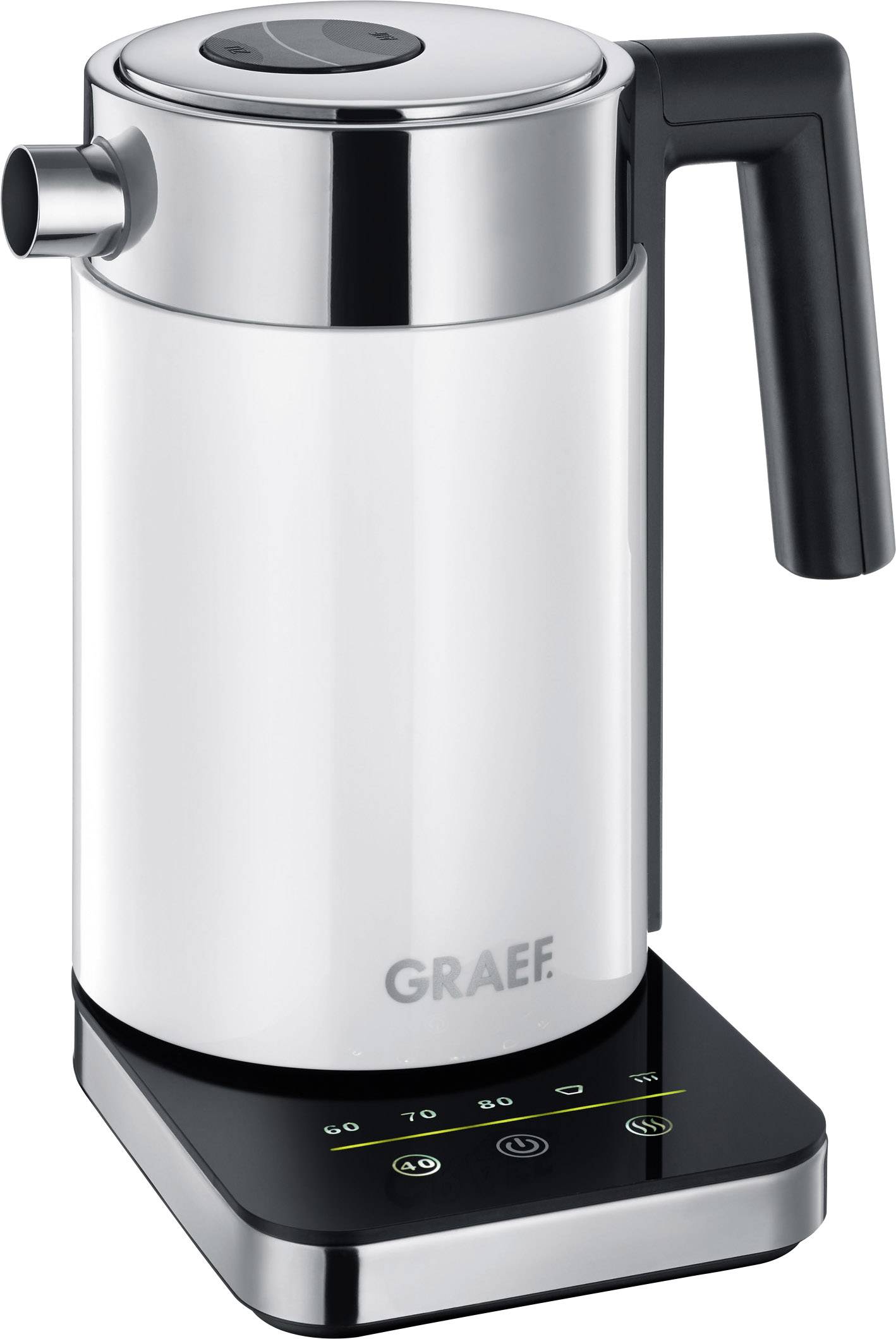 Innovativ, kompakt, schnell! Mit dem Graef 1-Liter Edelstahlwasserkocher WK 501 in Weiß holen Sie sich einen multifunktionalen Helfer in Ihre Küche, der Wasser nicht nur auf verschiedene Temperaturen erhitzen, sondern auch Babynahrung erwärmen bzw. Babyflaschen vaporisieren bzw. desinfizieren kann. Als erster Wasserkocher auf dem Markt setzt der Graef Wasserkocher mit dem innovativen Vapo-Programm neue Standards in Sachen Multifunktionalität. Über die Basisstation mit intuitivem Touch-Display starten Sie den Vaporisierungs-Vorgang. Das Babyfläschchen wird dabei verkehrt herum im mitgelieferten Korbeinsatz in den Wasserkocher gestellt. Schon nach ca. 4 Minuten ist das Fläschchen vaporisiert. Zum Erwärmen von Babykost wird das Gläschen ebenfalls im Fläschchenkorb mit der 40°C- und Warmhalte-Taste schonend auf die optimale Temperatur erwärmt. Der WK 501 verfügt über eine 30 Min. Warmhaltefunktion. Auch wenn Sie den Wasserkocher dabei von der Basisstation abnehmen bleibt die Warmhaltefunktion aktiviert und erhitzt das Wasser nach dem Wiederaufsetzen erneut auf die eingestellte Temperatur. Der WK 501 ist mit der innovativen Handbrüh-Taste für Filterkaffee ausgestattet. So bereiten Sie den optimalen, per Hand aufgebrühten Kaffee zu. Die Temperaturautomatik sorgt für exakte Temperaturen und eine optimale Brühtemperatur von ca. 93 °C. Neben der 40°C- und Handbrüh-Taste bietet der Edelstahlwasserkocher WK 501 ebenfalls die Möglichkeit das Wasser auf 60°C, 70°C bzw. 80°C zu erhitzen und aufzukochen. So eignet sich der WK 501 auch ideal für die Zubereitung verschiedenster Teesorten.