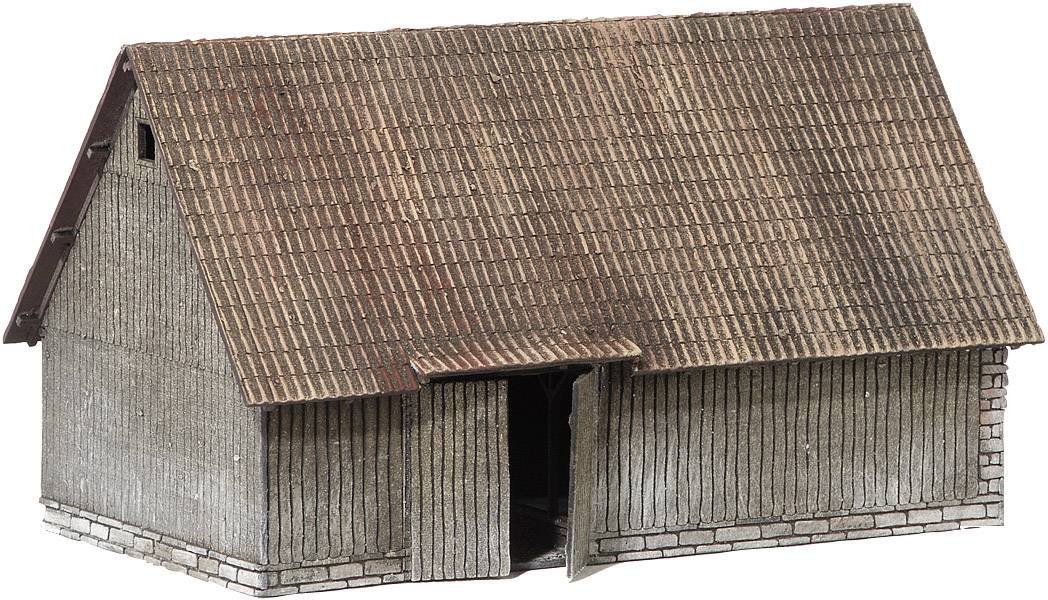 Scheune mit Ziegeldach, mit Inneneinrichtung, 2mm-Karton, laser-graviert und -geschnitten, Scheune; Bad Windsheim (Oberfranken); der Bausatz sollte individuell bemalt werden
