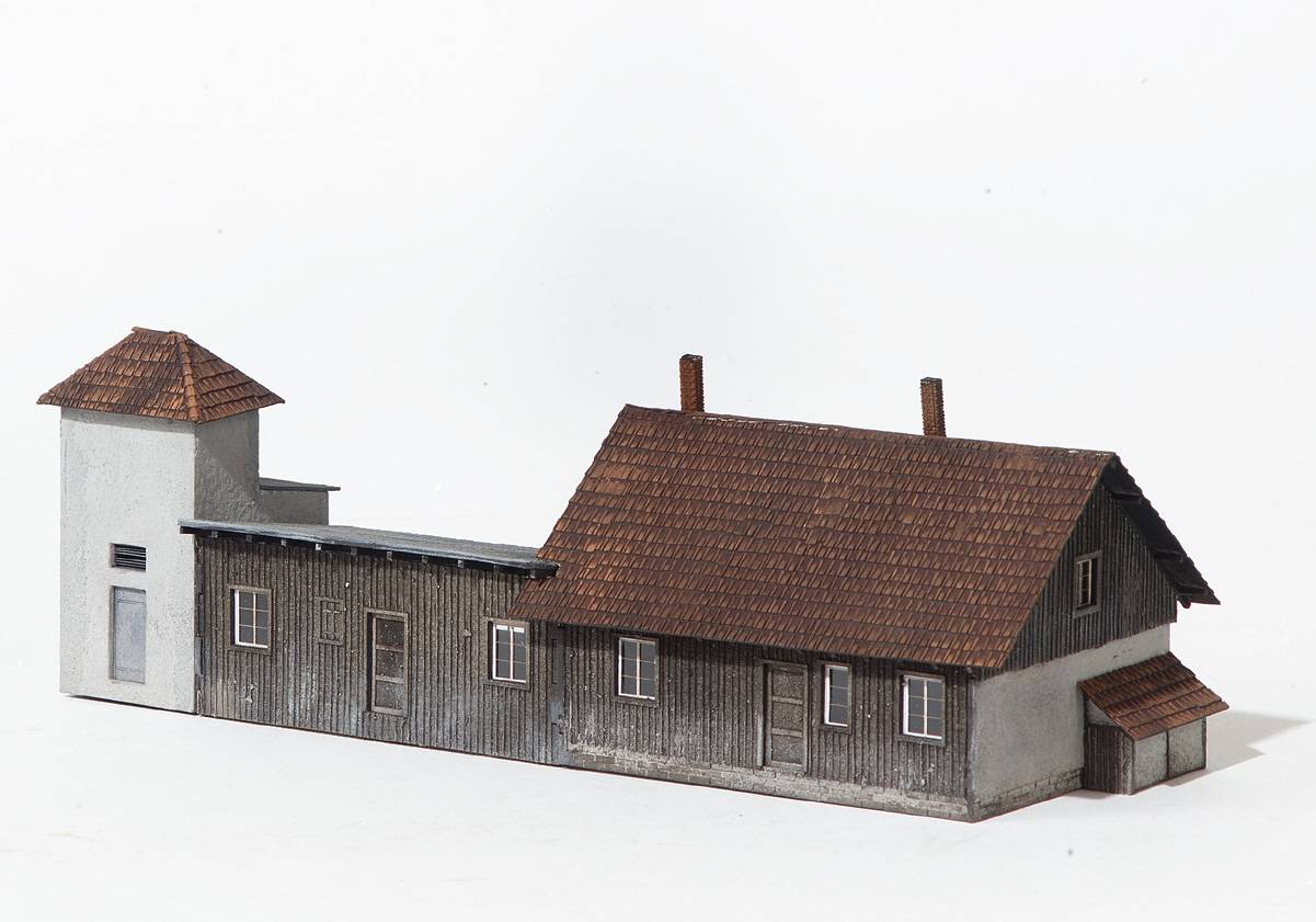 Steinbruchverwaltung, 2mm-Karton, Holz, laser-graviert und -geschnitten, Steinbruchverwaltung mit Trafohaus und Schuppen, Steinbruch bei Neustadt a.d. Donau, 2004; der Bausatz sollte individuell bemalt werden