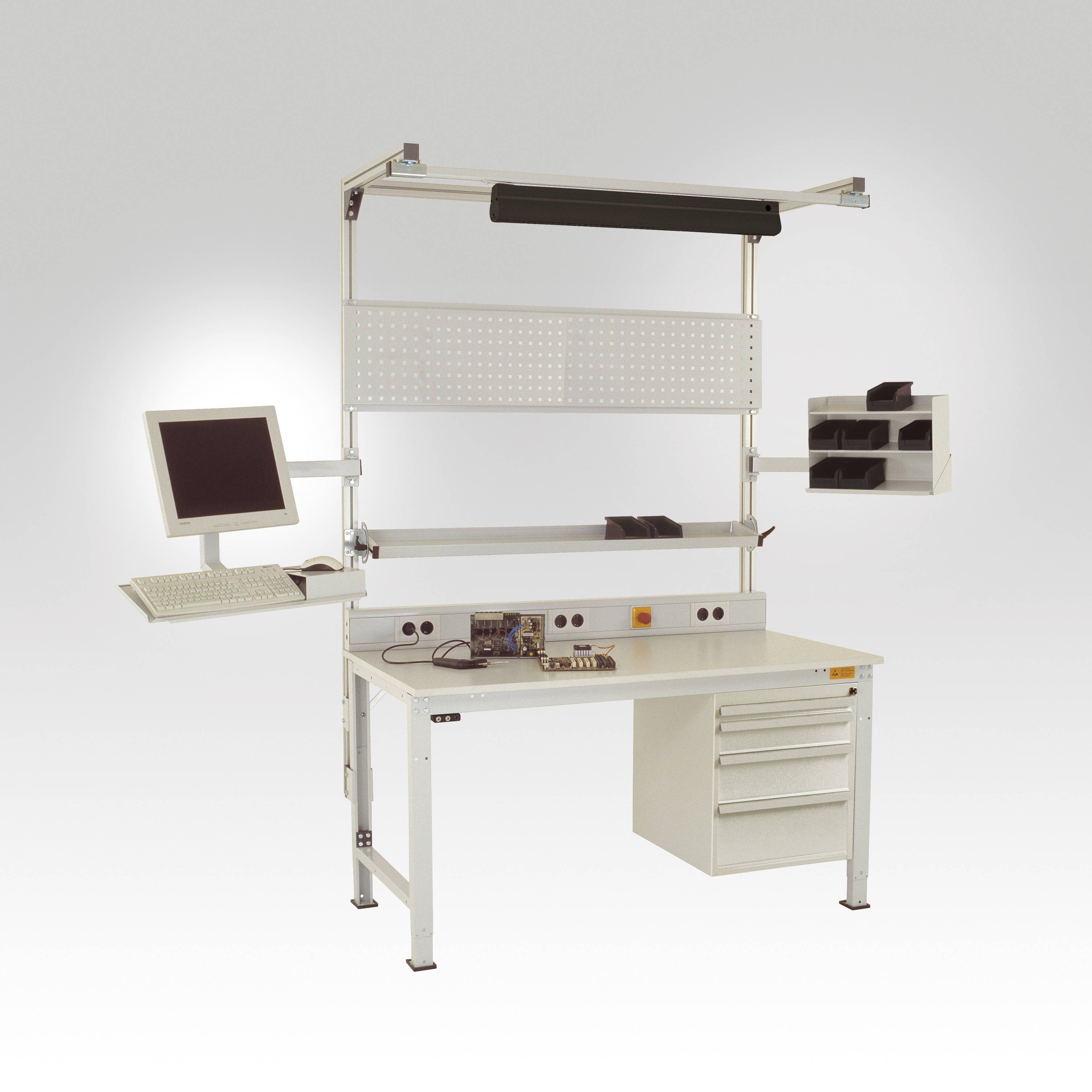 Die fortschreitende Entwicklung in der Elektronik tendiert zu immer kleineren Komponenten. Mit der ständig verkleinerten Größe diverser Bauteile werden auch die mikroskopisch kleinen Abstände zwischen den Isolatoren und Schaltungen innerhalb der Bauteile immer geringer, so dass geeignete Statikschutzmaßnahmen erforderlich werden. Winzige statische Entladungen sind für den einzelnen Menschen nicht spürbar, aber dennoch schädlich für elektronische Bauelemente und Komponenten. Erschwerend kommt hinzu, dass der entstandene Schaden, der durch die elektrostatische Ladung entsteht, mit dem bloßen Auge nicht zu erkennen ist. Elektrostatisch geschützte Bereiche und ESD-Einzelarbeitsplätze sind fast in der gesamten Elektronik- und Halbleiterfertigung erforderlich. Mit unseren ESD-Arbeitsplatzsystemen helfen wir Ihnen die elektrostatische Entladung zu vermeiden und Ihre Bauteile zu schützen. Kompletter Gehäuse-Unterbau für ESD-Arbeitstisch CANTOLAB . Für die intelligente und saubere Ordnung am Arbeitsplatz mit einer Breite von 500 mm, einer Tiefe von 580 mm und einer Höhe von 560 mm. Das Gehäuse besteht aus einer massiv verstärkten Stahlblechkonstruktion, hochwertig pulverbeschichtet in der Farbkombination HF 0002 = Korpus lichtgrau RAL 7035 leitfähig und Schubfächer brillantblau RAL 5007 leitfähig. Belastbar ist das Gehäuse für alle CANTOLAB ESD-Arbeitstische bis 200 kg. Das Gehäuse ist an CANTOLAB ESD-Arbeitstischen mit einer Tischtiefe von 800 mm einsetzbar. Serienmäßig ausgestattet ist das Gehäuse mit Zylinderschloss und 2 Schlüsseln sowie mit Zentralverschluss. Das Gehäuse hat eine Nutzhöhe von 500 mm und besteht aus 4 Schubfächern mit den Blendenhöhen 3 x 100 , 1 x 200 mm. Die Schubfächer sind bis 80 % ausziehbar und bis 35 kg belastbar. Die Schubfächer sind mit einer großen Griffleiste ausgestattet. Darüber hinaus ist das Gehäuse noch mit einer Einzelauszugssperre ausgestattet. Diese verhindert das unbeabsichtigte, gleichzeitige Öffnen von mehreren Schubfächern und verringert somit die Quetsch- und Verletzungsgefahr.