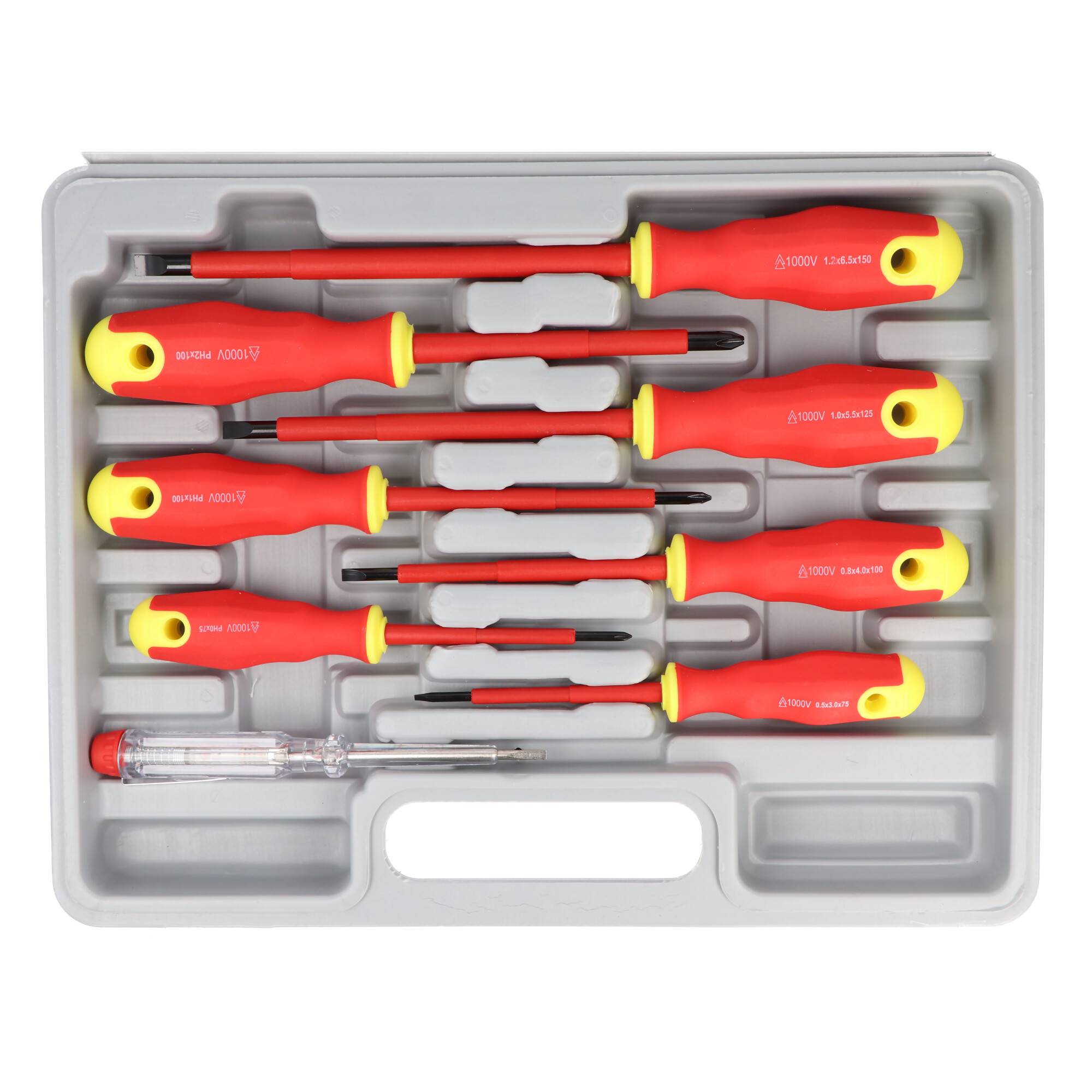 • 3x Kreuzschlitz Schraubendreher (PH0X75mm, PH1X100mm, PH2X100mm) , 4x Schlitz Schraubendreher (3X75mm, 4X100mm, 5.5X125mm, 6.5X150mm),