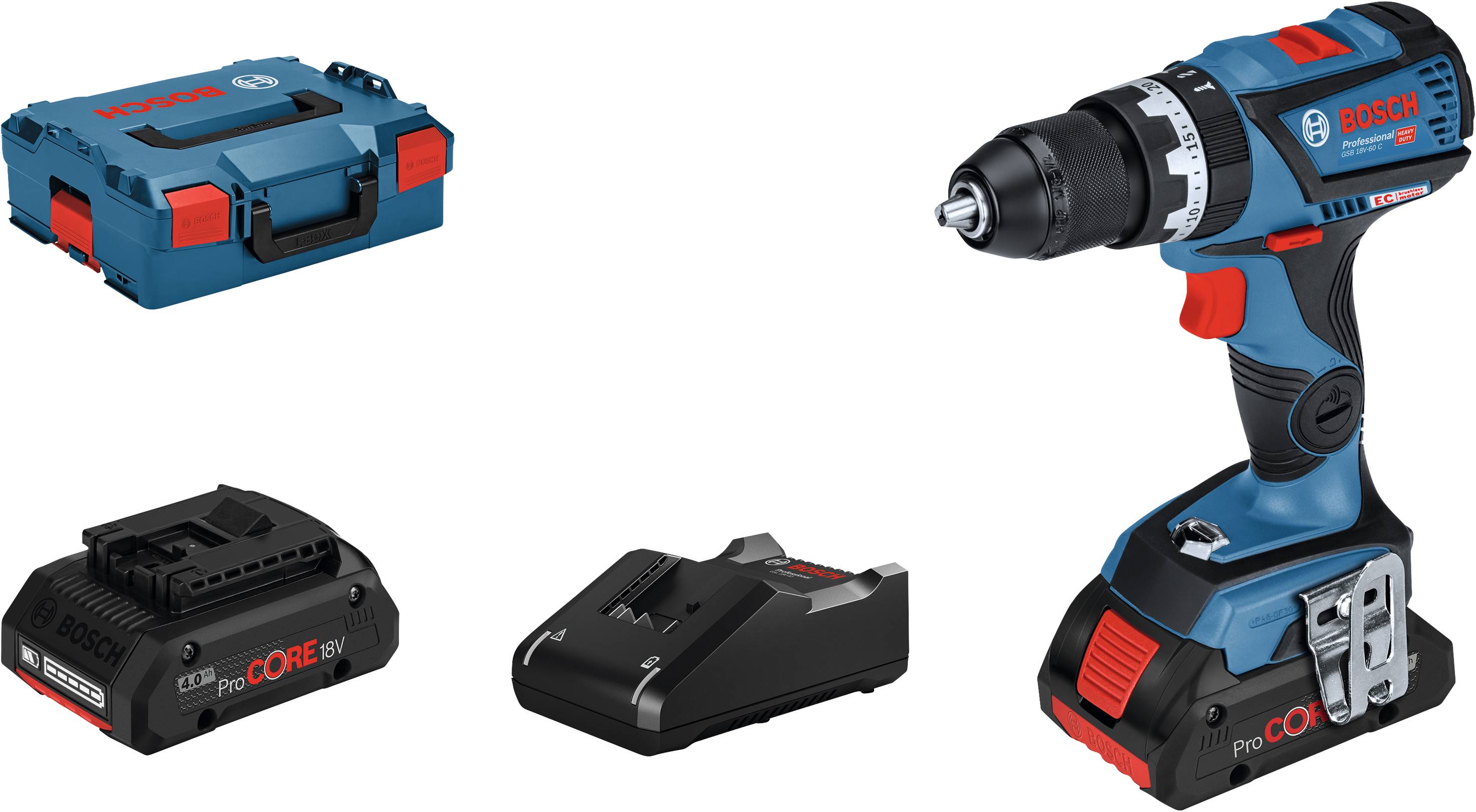 Akku-Schlagbohrschrauber GSB 18V-60 C. Werkzeugkonfiguration in der 18-Volt-Klasse. Personalisierte Einstellungen wie für die Präzisionskupplung können per Smartphone an die Anforderungen angepasst und gespeichert werden. Sensitivität der Funktion KickBack Control ebenfalls über Fernzugriff verstellbar. Kompatibel mit TrackMyTools, dem intelligenten Bestandsmanagementsystem von Bosch. Kickback Control erhöht die Anwendersicherheit in Vergleich zu Elektrowerkzeugen ohne diese Funktion. Das Elektrowerkzeug wird abgeschaltet, wenn es sich plötzlich um die Bohrachsen dreht. Integrierte Schlagbohrfunktion für Bohren in Mauerwerk bis zu 13 mm. Kompakte Bauform, sehr kurze Kopflänge (nur 184 mm) für perfekte Handhabung. Innovative COOLPACK-Akkus sorgen für eine optimale Wärmeabstrahlung und verlängern damit die Lebensdauer um bis zu 100 % (vgl. Li-Ionen-Akkus ohne COOLPACK). Bosch Electronic Cell Protection (ECP) schützt den Akku vor Überlastung, Überhitzung und Tiefentladung. Electronic Motor Protection (EMP) schützt den Motor vor Überlastung und sorgt für lange Lebensdauer. 13-mm-Auto-Lock-Bohrfutter. Integriertes LED-Licht mit Nachleuchtfunktion zur Beleuchtung des Arbeitsbereichs auch an dunklen Stellen. Montierbarer Bithalter für einfachen Transport und Aufbewahrung der Bits am Gerät. Praktischer Gürtelclip für bequemes Einhängen des Tools an Gürtel oder Leiter. Motorbremse für präzises Arbeiten bei Serienverschraubungen. Im Lieferumfang enthalten, 2 x Akku ProCORE18V 4.0Ah (1 600 A01 6GB), Schnellladegerät GAL 18V-40 Professional (1 600 A01 9RJ), L-BOXX 136 (1 600 A00 1RR).