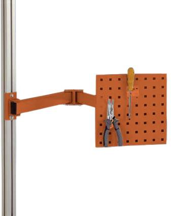 Die Werkzeugträgerplatte mit Doppelgelenk-Schwenkausleger für alle CANTOLAB und ALU, dient zur Optimierung der Arbeitsleistung durch die Werkzeugbereitstellung direkt am Arbeitsplatz. Die Gesamtbreite der Werkzeugträgerplatte beträgt 305 mm und die Gesamthöhe 305 mm. Die Werkzeugträgerplatte ist hochwertig pulverbeschichtet in Rotorange RAL 2001. Die Platte ist im 38 mm Raster gelocht. Befestigt wird die Werkzeugträgerplatte an mit Hilfe des Alu-Aufbauportal. Der Doppelgelenk-Schwenkausleger hat eine Länge von 700 mm und eine Tragkraft von max. 10 kg. Die Werkzeugträgerplatte mit Doppelgelenk-Schwenkausleger dient zur Optimierung der Zugriffszeiten bei Rückgriff auf Werkzeuge. Die Arbeitsleistung durch die Werkzeugbereitstellung direkt am Arbeitsplatz kann so schnell verbessert werden. Dank des Doppelgelenk-Schwenkauslegers lässt sich der Werkzeugträger passgenau und individuell am Arbeitsplatz positionieren und nach Anwendung auch wieder aus dem Greif- und Sichtbereich entfernen.