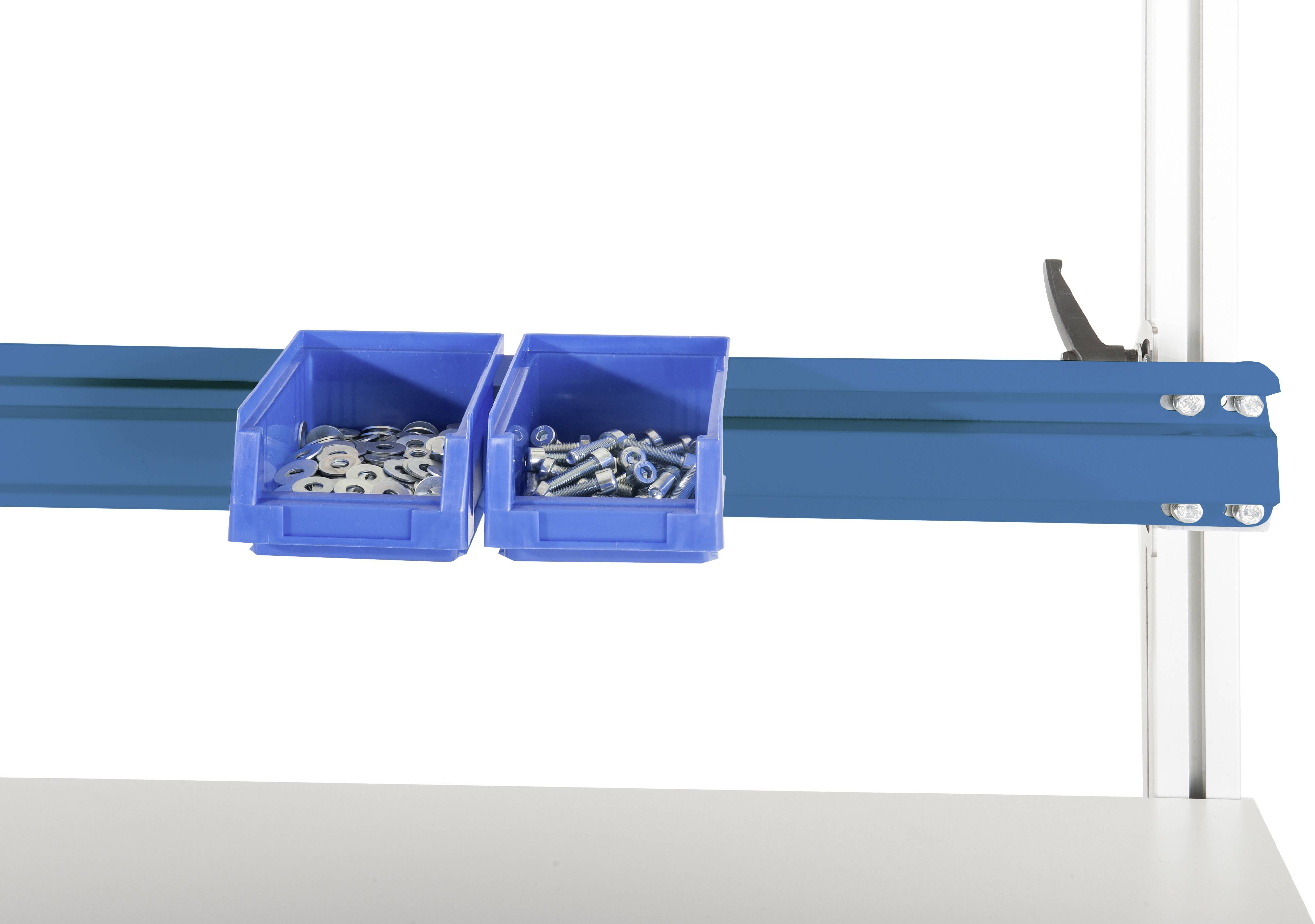 Ein wildes Durcheinander und mangelnde Übersicht führen oft zu unnötigen Zeitverlusten. Dies passiert oft bei Kleinteilen, die ungeordnet auf den Arbeitsflächen gelagert werden. Durch die Boxenträgerschiene kann diese Problematik vermieden werden. Sie wird an Alu-Aufbauportalen befestigt und ist stufenlos neigbar. Sichtlagerboxen mit Haltenase können einfach an die Boxenträgerschiene eingehängt werden. Die Tragkraft der Boxenträgerschiene beträgt 40 kg. Die Boxenträgerschiene hat eine Breite von 996 mm, eine Tiefe von 2 mm und eine Höhe von 100 mm. Sie ist aus Stahl gefertigt und in Brillantblau RAL 5007 hochwertig pulverbeschichtet.