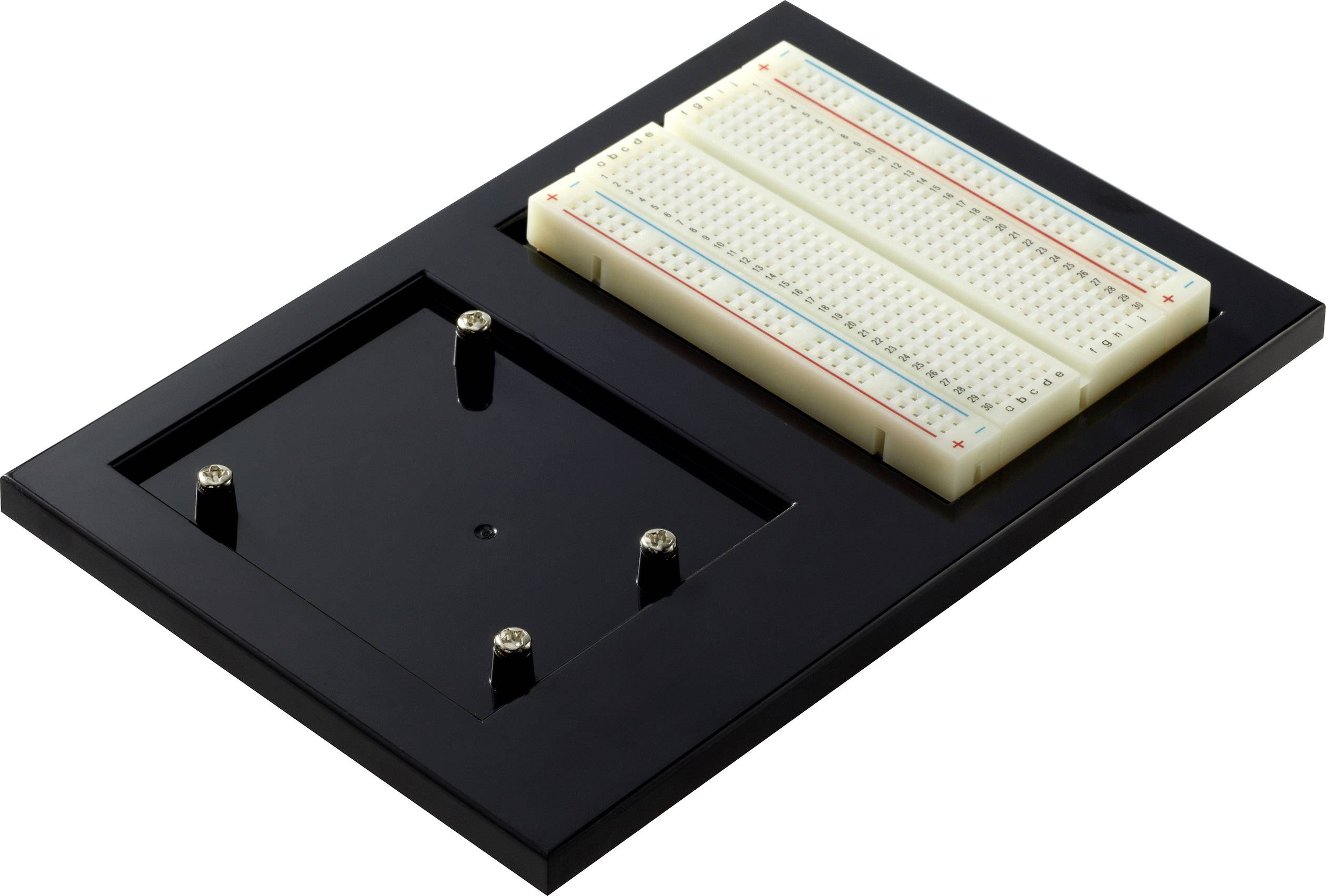 Mit der Projekt-Halterung können das Arduino® UNO und die Steckplatine miteinander verbunden werden. Sie enthält zwei Rillen. Die Rille von 88 x 60 mm eignet sich zum Befestigen einer Steckplatine mit 830 Löchern. Die andere Rille eignet sich für das Arduino® UNO. Die Position der 4 Löcher für die M3-Schrauben stimmt mit den Montagelöchern des Arduino® UNO überein. Die Halterung wird mit 4 Schrauben (M3 x 8) geliefert.