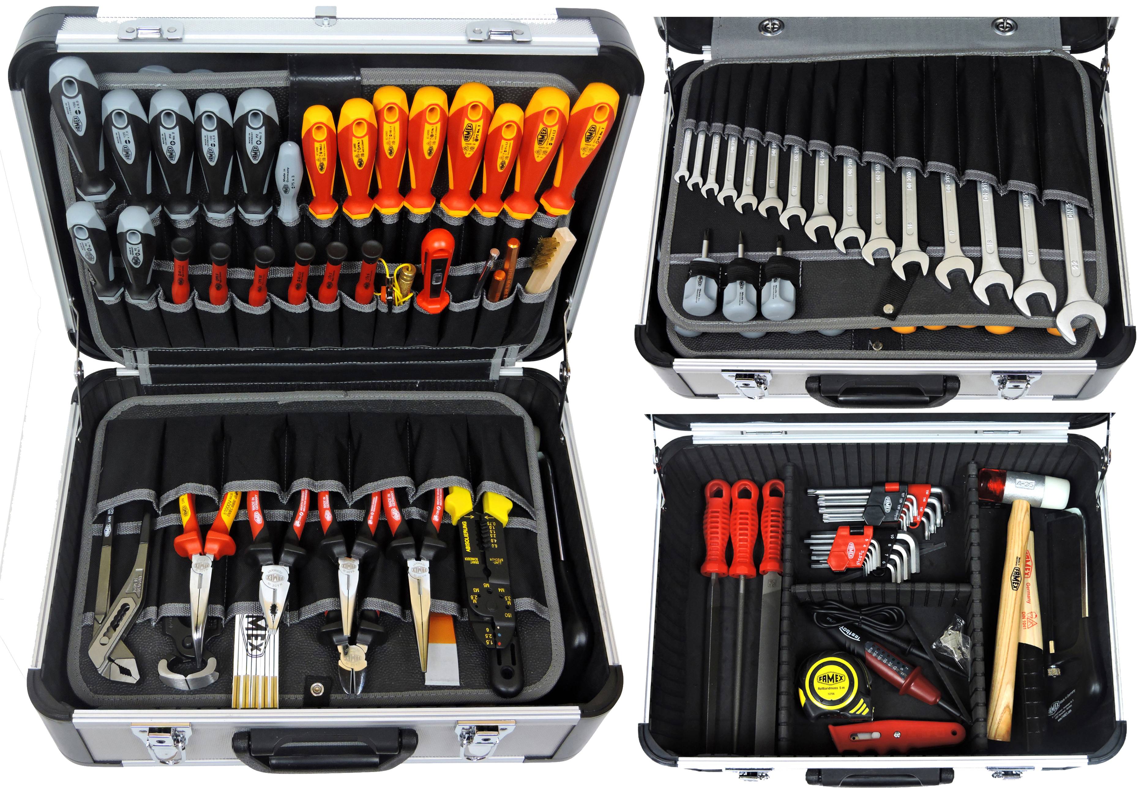 Hochwertiger Alukoffer mit 54 Einstecktaschen für das Werkzeug