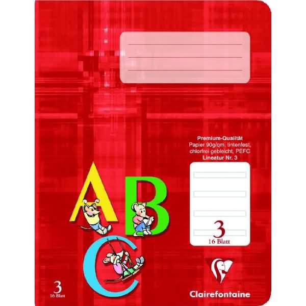 Lin. 3 - 3. Schuljahr liniert. Besonders robuster Einband; Zweifarbig, flexibel mit abwischbarer Zellophanfolie kaschiert.Clairefontaine die NR. 1 in Papier. "Velin" d.h. satiniertes Papier, schneeweiß, holzfrei, 90g/ qm. Spezielle Glättung des Papieres für eine besonders angenehme und leichte Schriftführung. Format DIN A5 - 16 Blatt