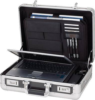 Laptop Attachékoffer C-1 "CARBON" Look, verstärkte Kanten, Heavy-Duty-Griff, zwei Zahlenkombinationsschlössern, abnehmbarer Schultertrageriemen. Innen: Herausnehmbare Polsterung für das Laptop, herausnehmbares Organizerteil im Deckel mit: Zwei A4 Fächern, vier Stifteschlaufen, drei Visitenkartenfächern, drei Klettverschlusstaschen.