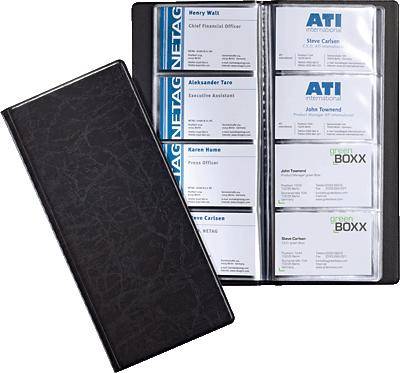 Visitenkartenalbum aus genarbter Folie mit eingeschweißten transparenten Hüllen für 192 Visitenkarten 57x90 mm.
