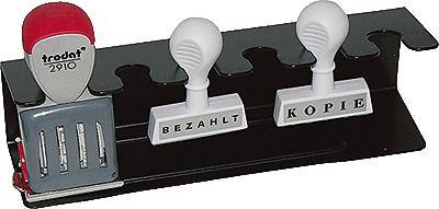 Stempelträger gerade für 6 Stempel, aus pulverbeschichtem Metall mit Ablagefach für Büroklammern.
