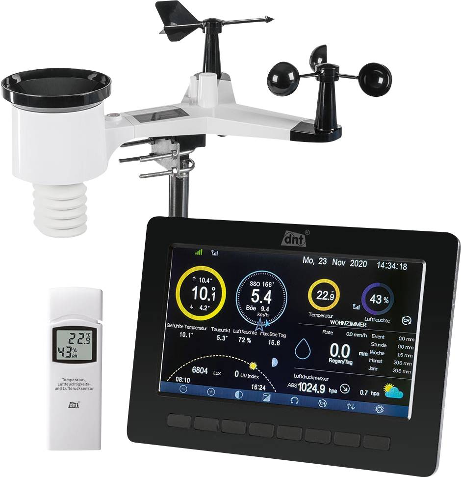 Integriertes Solarpanel für Stromversorgung des Kombi-Senders, batterieunterstützt mit 2x Mignon/AA/LR6-Batterien (nicht im Lieferumfang) · Wetterdatenaufzeichnung mit wählbaren Intervallen sowie tabellarische und grafische Auswertungen · Sensoren für Niederschläge, Windgeschwindigkeit/ Windrichtung, Innen-/Außenluftfeuchtigkeit, Luftdruck, Innen-/Außentemperatur, Beleuchtungsstärke/UV-Index · WLAN-Verbindung mit Smartphone/Mobilgerät via kostenloser Wetterportal-Apps · Alarm: Gewitterwarnung, Temperatur, Feuchtigkeit, gefühlte Temperatur, Taupunkt, Regenfall, Windgeschwindigkeit, Luftdruck, Sturmböen · Min.-/Max.-Wert-Anzeigen mit Zeitstempel-Hinterlegung · Kalibriermöglichkeit mit Referenzmessgeräten · Für Tischaufstellung und Wandmontage geeignet · Kategorie: Wetterstation/Raumklimastation · Frequenz: 868 MHz · Reichweite: Bis zu 100 m (Freifeld) · Uhrzeit-/Datumsanzeige: Ja · Messung von: Temperatur, Luftfeuchtigkeit, Niederschlag, Windgeschwindigkeit, Luftdruck, Beleuchtungsstärke · Messbereiche: Temperatur: Raumklimasensor: -10 bis +60 °C, Kombi-Sensor: -40 bis +60 °C · Luftfeuchtigkeit: Raumluftfeuchte: 10–99 %, Außenluftfeuchte: 10–99 %, · Regen:0–9999 mm, · Wind: 0–50 m/s, · Beleuchtungsstärke: 0–200k Lux, · Luftdruck: 300–1100 hPa · Auflösung: Temperatur: Raumklimasensor: 0,1 °C, Kombi-Sensor: 0,1 °C · Luftfeuchtigkeit: Raumluftfeuchte: 1 %, Außenluftfeuchte: 1 %, · Regen: 0,3/1 mm (bis/ab Regenmenge 1000 mm) · Luftdruck: 0,1 hPa · Genauigkeit: Temperatur: Raumklimasensor: ±1 °C, Kombi-Sensor: ±1 °C · Luftfeuchtigkeit: Raumluftfeuchte: ±5 %, Außenluftfeuchte: ±5 %, · Regen: ±10 %, · Wind: ±1 m/s bzw. 10 % (bis/ab 5 m/s), · Beleuchtungsstärke: ± 15 %, · Luftdruck: ±3 hPa · Anzahl der Raumklima- · Sensoren, max.: 9 (1 Mastersensor enthalten, weitere 8 optional erhältlich DNT000005) · Displaydiagonale: 17,8 cm (7") · Messintevall: Alle 60 s · Versorgungsspannung: Station: Netztei