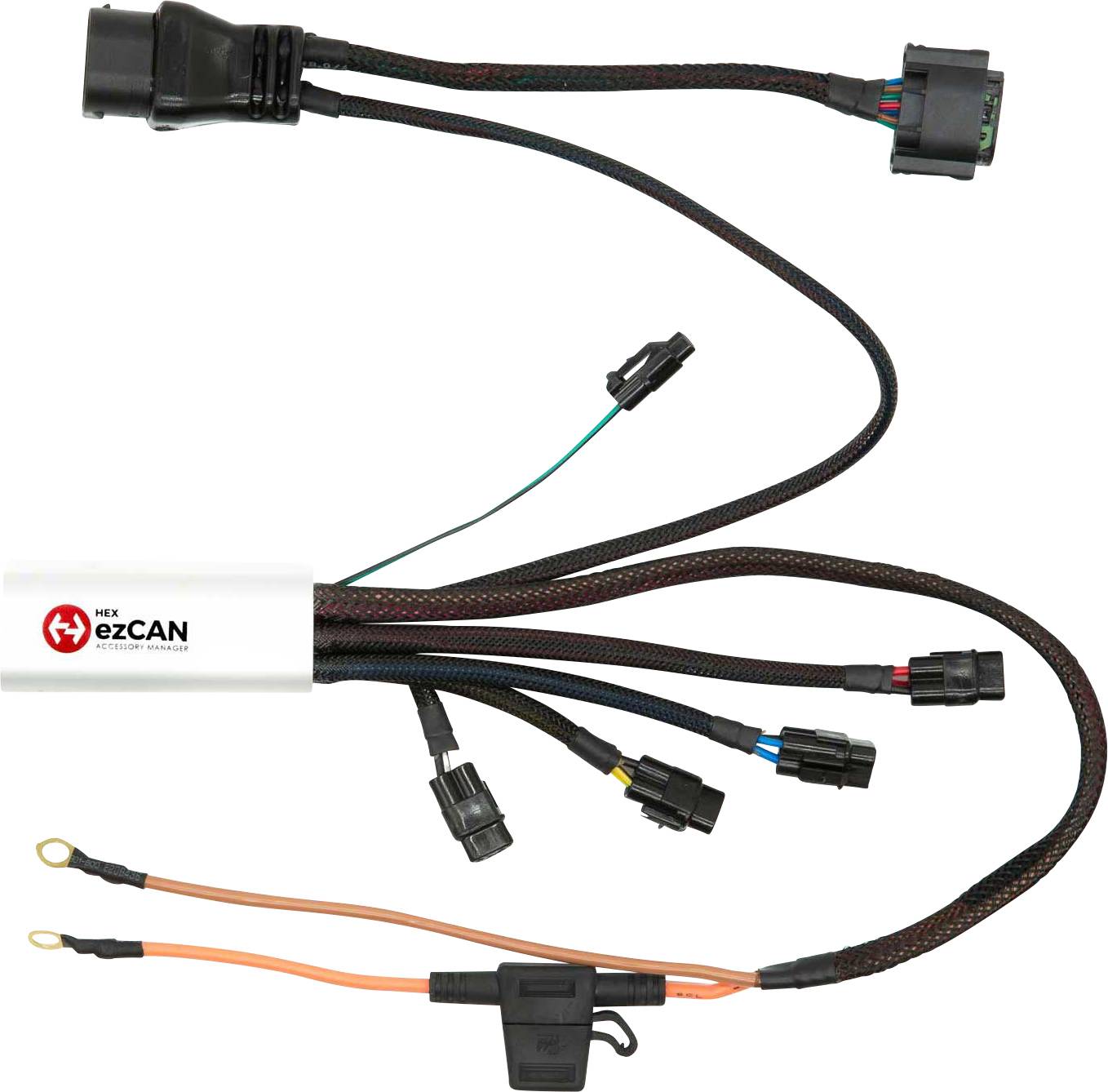 HEX ezCAN 4 Kanal CAN Bus Zubehörmanager zur frei programmierbaren Ansteuerung von nachträglich verbauten Scheinwerfer, Hupen, Bremsleuchten und anderen elektrischen Verbrauchern über die originalen Schalter eines BMW Motorrades. Spritzwassergeschützt, max. Last 4x10A (25A für 20 sek.), jeweils elektronisch abgesichert, inkl. je 4 Verbindungsstecker (2 oder 3 adrig), USB Kabel und Montagematerial, sowie Anleitung (EN) und Windows PC / Mac Konfigurationssoftware (Online). Eintragungsfrei durch E11 Prüfzeichen.