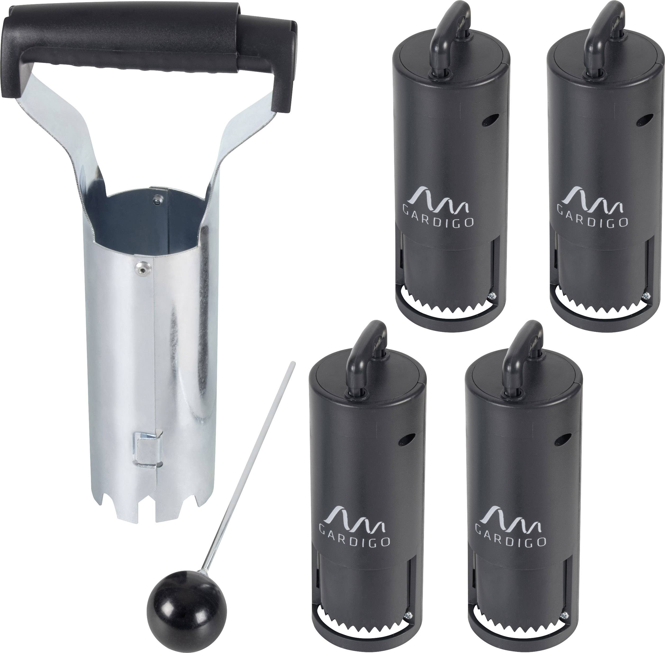Den Erdlochstecher benutzen Sie, um ein Loch in diesen zu bohren. Drehen Sie ihn einfach in den Boden ein. In die mit diesem Gerät gegrabenen Löchern passen die Gardigo Wühlmausfallen genau hinein. Setzen Sie die Falle mit den Öffnungen in Tunnelrichtung in das Loch.