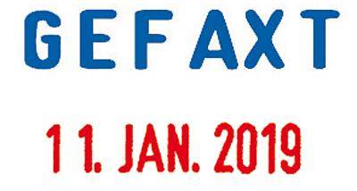Selbstfärbender Printy Dater mit Lagertext GEFAXT, Schrifthöhe 3,8 mm. Abdruck 2 farbig.