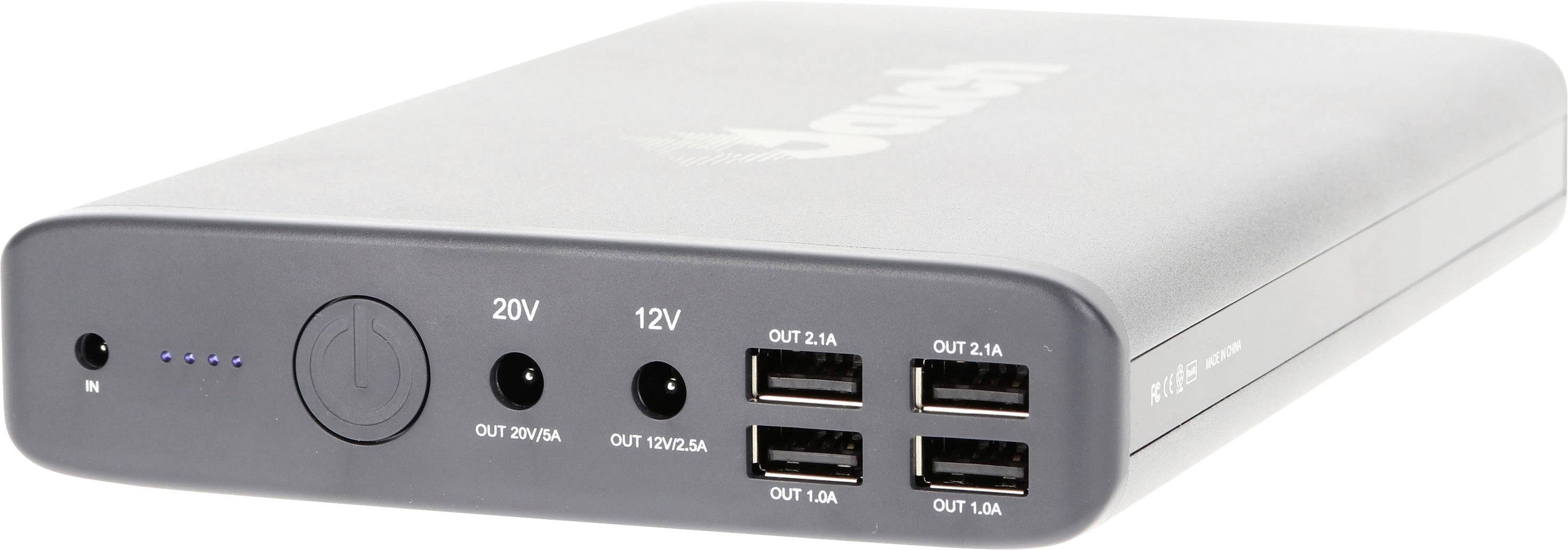 Dabei kombiniert diese kompakte Powerbank vier USB-Ausgänge mit zwei DC-Rundbuchsen (12 und 20 V), welche gleichzeitig genutzt werden können. Dank der hohen Kapazität können Sie ein iPhone 6 beispielsweise 17 Mal, ein Samsung Galaxy S6 elf Mal laden oder ein Notebook bis zu acht Stunden betreiben.