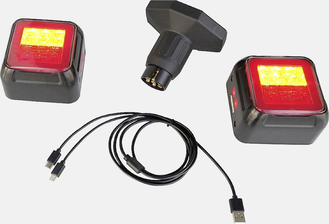 Funk LED Anhängerbeleuchtung mit LiOn Akku und Magnethalterung, Verbindung per bluetooth 4.0 mit 2,4 GHz bis zu 25 m, 2x2500 mAh Lion Akku Kapazität für bis zu 7 h Betriebszeit, Ladezeit ca. 2,5h per USB-C® Stecker mit 2,0 A bei DC 5V, IP64, Bremslicht, Rücklicht, Blinker. Sender mit 7 plg Stecker. Nur für Land und Forstwirtschaft.