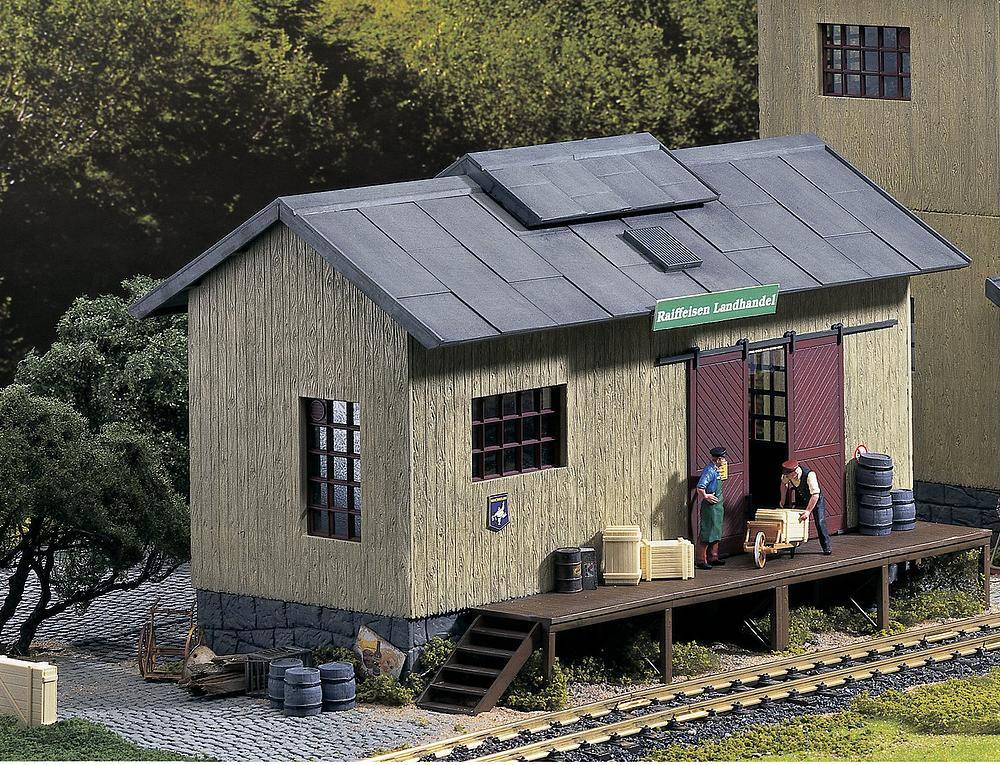 Jeder Bahnhof mit Güterumschlag verfügt über ein eigenes Lagerhaus. Das Lagerhaus hat vorne und hinten Laderampen, so daß auf der einen Seite Güterwaggons und auf der anderen Seite Lastwagen be- und entladen werden können. Die zweiflügeligen Tore sind beweglich. Dem Bausatz liegen neben "BayWa"-Aufkleber auch solche für die Gestaltung eines "Raiffeisen"-Gebäudes bei.