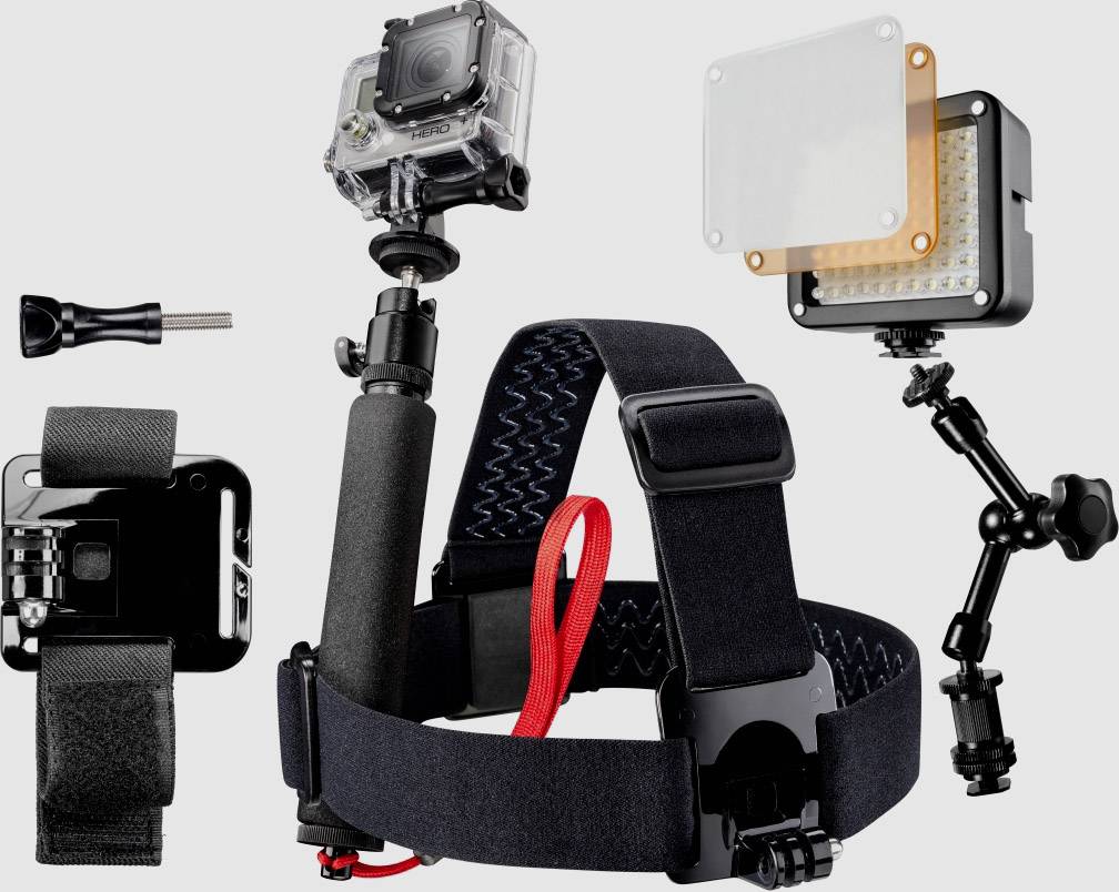 Das mantona GoPro Konzert und Party Set ist ideal geeignet, wenn Sie ein Set benötigen mit dem Sie das nächste Event mitfilmen möchten. Das Handstativ lässt sich in Verbindung mit der LED und des Gelenkarms schnell zu einem Selfie Stativ umbauen und ermöglicht auch in dunklen Konzerthallen oder bei Dunkelheit gut ausgeleuchtete Videos und Bilder zu erstellen. Das Handstativ erhöht nicht nur die Entfernung bei Selfies sondern dient auch dem Filmen aus einer erhöhten Position z.B. über eine Menschenmenge hinweg. Die Armbefestigung ergänzt das stabilisierte Filmen, wenn die Kamera am Handgelenk oder sogar Fußgelenk montiert ist. Über den Helmgurt kann man zudem schöne Ego Shots machen und so das filmen, was man selbst sieht. Handstativ Bei welchem Sport auch immer – das mantona Handstativ eignet sich ideal, um sich selbst dabei zu filmen. Außerdem bietet es mehr Stabilität und ermöglicht natürlich auch eine größere Entfernung zum Motiv, wenn Sie aus der Ich-Perspektive filmen. Vor Verlust beim Einsatz schützt eine praktische Handschlaufe. Helmgurt Mit dem mantona Helmgurt können Sie Ihre GoPro an jedem geschlossenen Helm oder direkt am Kopf sicher befestigen, wodurch sich der Gurt für fast alle Sportarten eignet. Er ist längenverstellbar und lässt sich somit individuell anpassen. Für rutschfesten Halt sorgt eine Anti-Rutsch-Beschichtung. Montiert wird die GoPro direkt über den Schnellverschluss am Helm. Armbefestigung Mit dieser praktischen Armbefestigung inkl. Schnellverschluss können Sie mit Ihrer GoPro bei fast allen Aktivitäten filmen. Vor allem eignet sie sich für Aktivitäten in der Luft wie z.B. Fallschirmspringen, Paragliding, etc. Das Armband ist elastisch und passt sich optimal Ihrem Arm an, so Ihre GoPro sicher befestigt ist und kein Verrutschen zulässt. LED Videoleuchte LED80B dimmbar Die mit 5 AA-Batterien betriebene Videoleuchte ist ideal geeignet für alle Camcorder und Videokameras. Die 80 stufenlos dimmbaren LED sorgen für eine hohe Lichtausbeute und damit für die nötige Helligkeit bei nicht ausreichendem Umgebungslicht. Dies ist besonders praktisch bei Aufnahmen im Dunkeln oder unzureichend ausgeleuchteten Räumen. Somit müssen Sie nie wieder schlecht beleuchtete Filme befürchten!