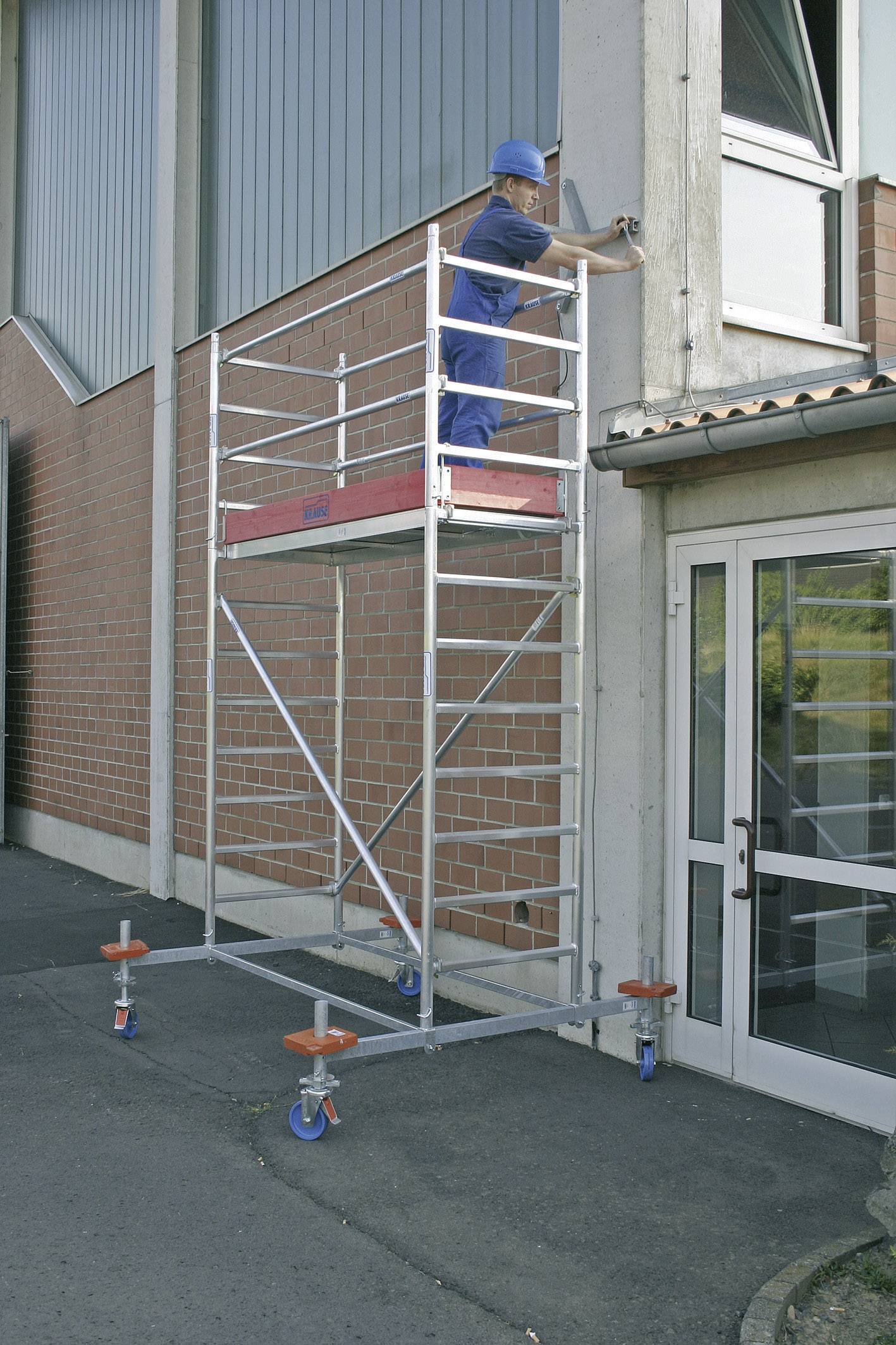 TÜV-geprüft, Belastbarkeit 200 kg/m² (Gerüstgruppe 3) nach EN 1004 · Eine stabile Stahlfahrtraverse sorgt für sicheren Stand · Höhenverstellbare Fahrrollen gewährleisten auch den Einsatz auf unebenem Gelände · Belagbühnen lassen sich problemlos (im 25 cm Abstand) zwischen den Diagonalen einhängen - Aufwendige Um- und Abbauten entfallen · Gerüstfeldbreite: 0,75 m.
