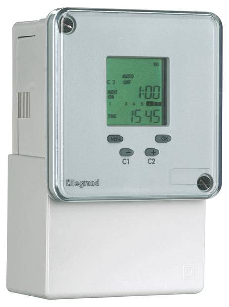Legrand MaxiRex D72/1 Plus, digitale Wochenzeitschaltuhr für Fronttafeleinbau und Wandmontage, 1 Kanal, 28 Schaltprogramme, Betriebsspannung 24 V 50/60 Hz und DC, Programmerstellung direkt am Gerät. Dauer EIN/AUS,, automatische Sommer-/Winterzeitumstellung, 6 Jahre Gangreserve, Ganggenauigkeit +/- 1 Sek/Tag, Kürzeste Schaltzeit: 1 Min., Fronttafeleinbau Abmessung: 72 x 72 mm. Schaltausgang: 1 Wechsler.