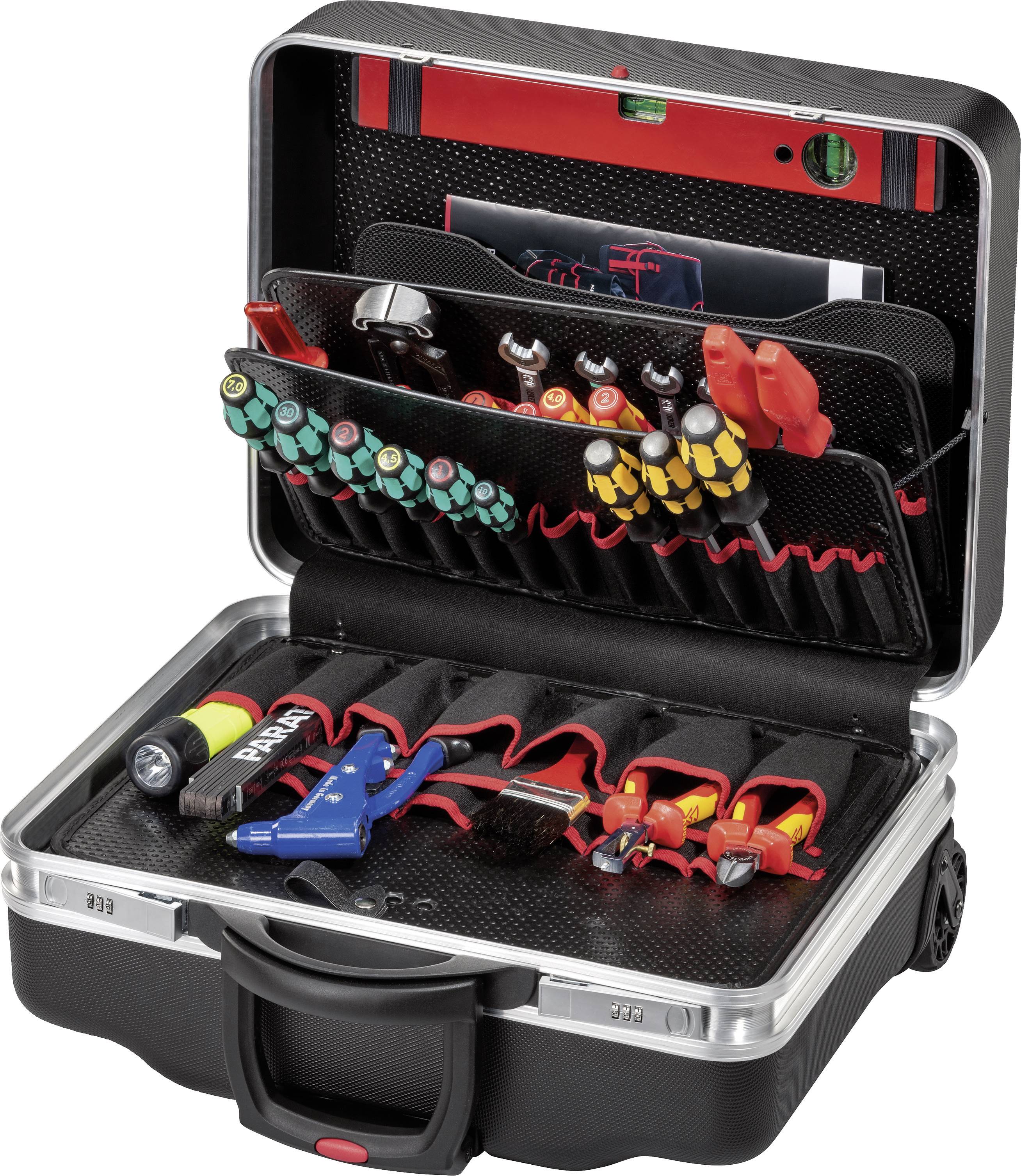 Großes Innenraumvolumen von ca. 36 Litern · Stabile X-ABS-Kunststoffschalen · 50 vernähte Einsteckfächer für Werkzeuge · Große Bodenschale mit 88 Millimetern Höhe und freier Unterteilung · Sicherer und leichtgängiger Transport dank Zahlenschloss und gummierter Rollen · 1 Werkzeugtafel mit 25 Einsteckfächern, 1 Klemmfach 400 mm · 1 Werkzeugtafel mit 10 Einsteckfächern · 1 Abdeckplatte mit 15 Einsteckfächern, 1 Klemmfach 400 mm · 1 Bodenschale mit Abdeckplatte, Höhe 88 mm, frei unterteilbar · 1 Dokumentenfach im Deckel, 2 Visitenkartenfächer, 2 Stiftschlaufen · 2 Zahlenschlösser.