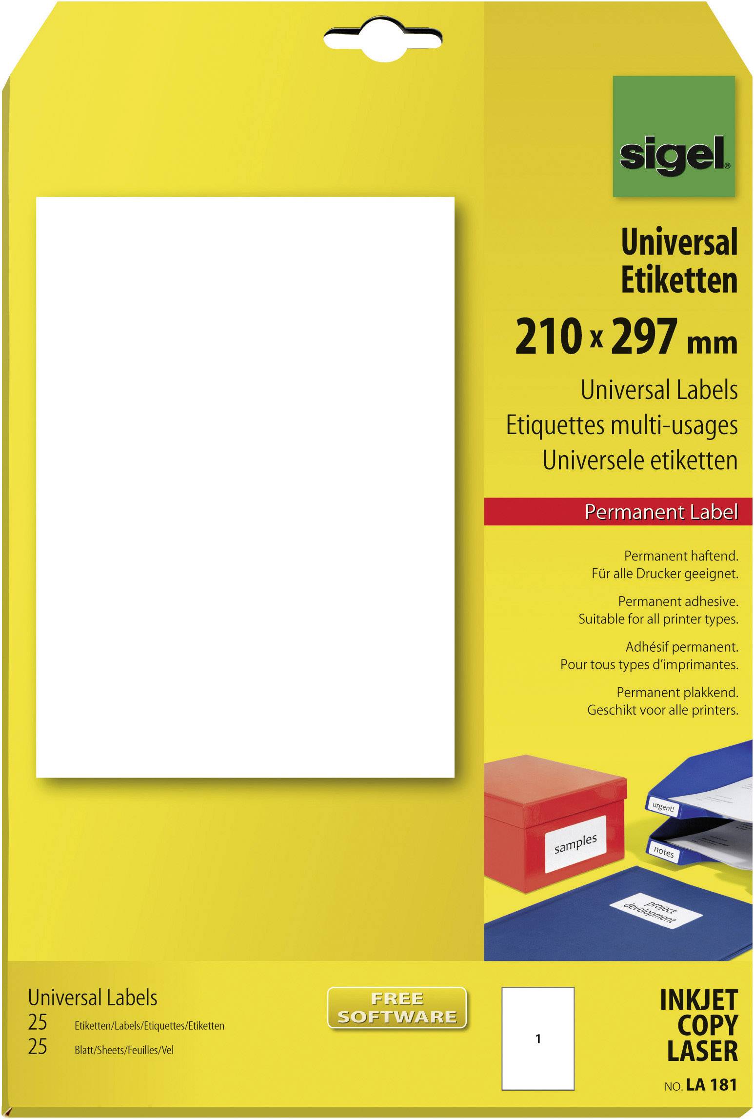Weiße, permanent haftende Universal Etiketten im Format: 210x297 mm. Hervorragend geeignet zur Beschriftung und Kennzeichnung verschiedenster Gegenstände. Klares Druckbild und optimale Geräteschonung dank 4seitiger Sicherheitskante. Für alle InkJet- und Laser-Drucker sowie Kopierer.