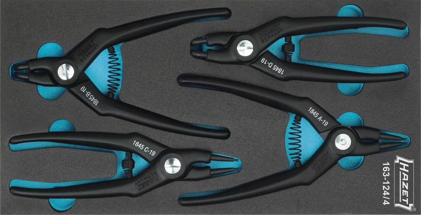 4teiliger Zangen-Satz für Sicherungsringe komplett (SmartCase L 1/3) · Safety-Insert-System - Alle Werkzeuge rüttelfest eingebettet - Fehlendes Werkzeug wird sofort bemerkt · Reinigungsmöglichkeit der Einlagen (Unter fließendem Wasser abbürsten, trocknen lassen - fertig!) · Passend für alle HAZET-Werkzeugwagen Assistent mit Schubfächern — — Für die Werkzeugwagen Assistent 173, 179 und 180 empfehlen wir zusätzlich Kunststoff-Einlage 173-36/5 oder Weichschaum-Einlagen 163-522x40 bzw. 163-522x50