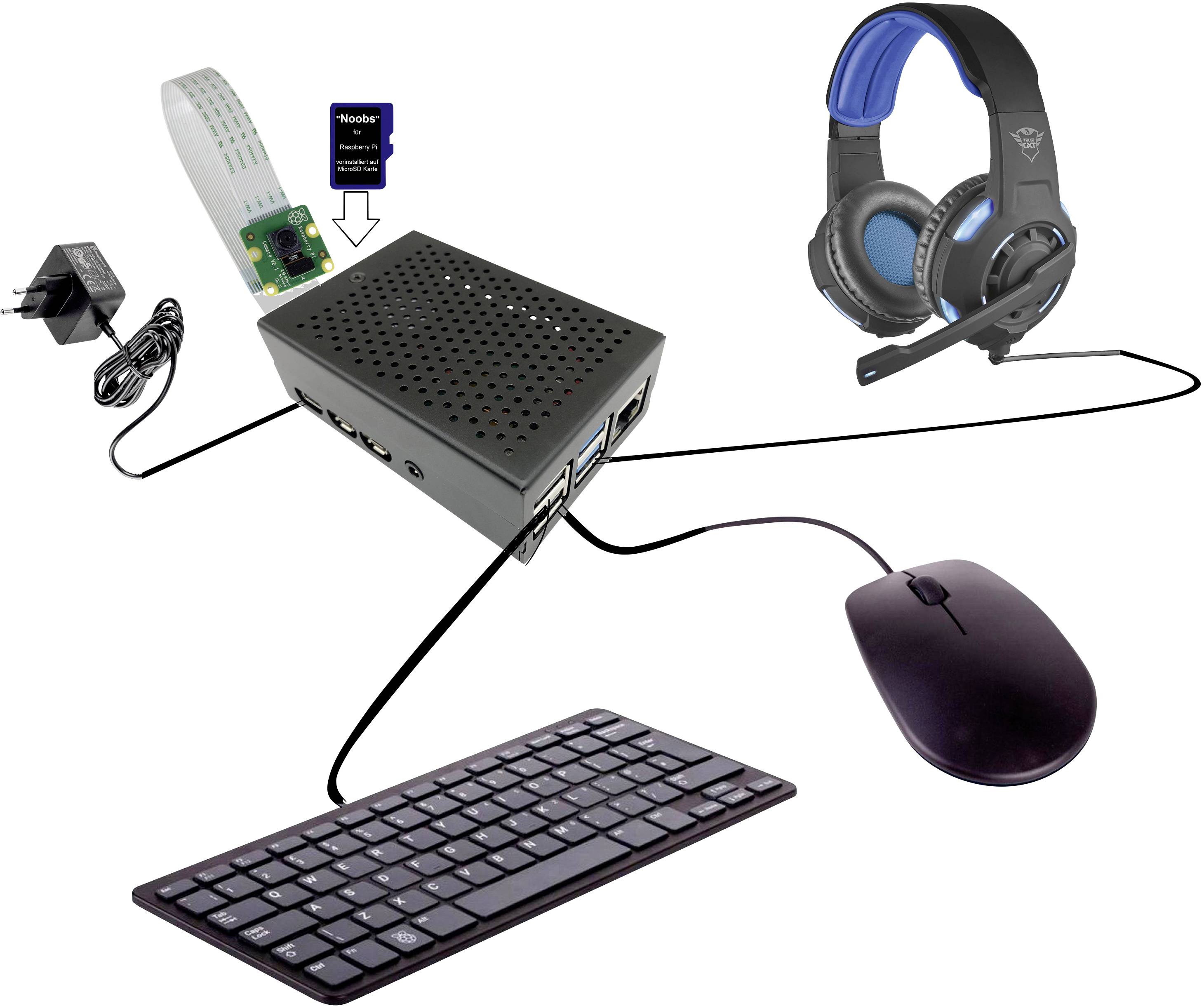 Raspberry Pi® 4 B (4 GB) + Raspberry Pi® Netzteil (5,1V / 3A) + Raspberry Pi® Tastatur + Raspberry Pi® Maus + Raspberry Pi® Kamera + SD-Karte mit vorinstallierten Noobs OS (32 GB) + Thrustmaster Y-300CPX Gaming Headset + Micro-HDMI-Kabel (1,8 m) + Netzwerk-Kabel CAT 6 U/UTP (1 m) + Aluminium-Gehäuse mit aktiven Lüfter