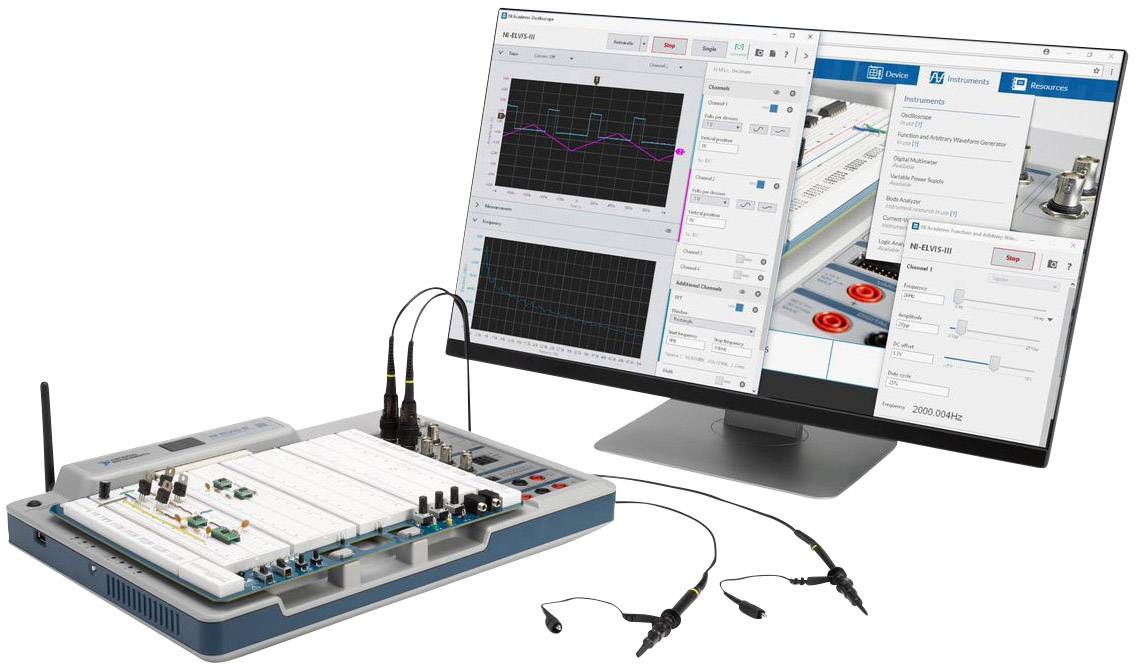 Bei der NI Educational Laboratory Virtual Instrumentation Suite (NI ELVIS) III handelt es sich um eine Lösung für technische Laborübungen im Rahmen des projektbasierten Lernens, die Messtechnik und Embedded-Design mit webbasierten Möglichkeiten kombiniert. So entsteht eine aktive Lernumgebung im Labor, für die Projektarbeit und den praxisorientierten Unterricht, die ein besseres Verständnis technischer Grundlagen und des Systementwurfs erlaubt. NI ELVIS III eignet sich für den technischen Unterricht, da die Lösung projektbasiertes Lernen, Teamwork und Schaltungsentwurf mit kursspezifischen Experimentierkarten und Laborübungen verbindet, die von Experten aus Industrie und Lehre entwickelt wurden. NI ELVIS III kann für künftige fachübergreifende Anwendungen erweitert werden, um Studenten den Berufseinstieg zu erleichtern.