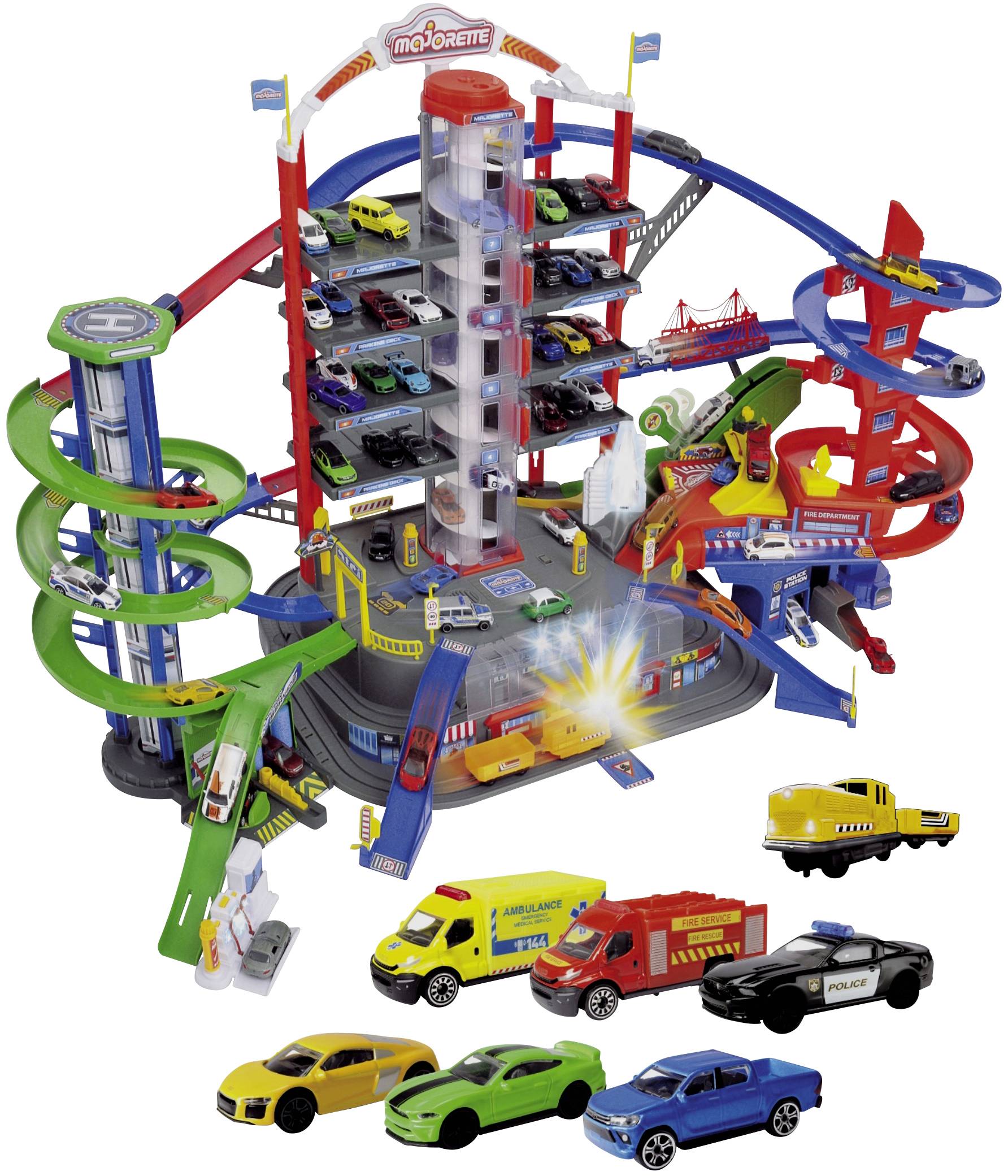 Majorette Super City Garage: In dieser Spielwelt ist immer was los Auf sieben Etagen mit zahlreichen Rampen, Bahnen und Spieldetails liefert die Majorette Super City Garage ultimative Spielideen rund um unsere Die-Cast-Spielzeugautos in Lizenz großer Marken. Zwei motorisierte Autoaufzüge bringen die Fahrzeuge bequem an einen der 35 Park- und Abstellplätze, bevor es über die Rampen wieder rasant hinabgeht. Sechs Licht- und Soundeffekte an den verschiedenen Sp ielstationen, machen das Großstadtleben noch realistischer. Natürlich ist der Grundstein für die Majorette Sammlung bereits enthalten. Sechs Die-Cast-Spielzeugautos in Lizenz von Audi, Ford, Toyota und Iveco machen als Sportwagen, Feuerwehr oder Polizeiauto das Erlebnis perfekt. Zusätzlich gehört ein batteriebetriebener Zug mit Anhänger zum Lieferumfang, für den die Batterien separat benötigt werden. Extra-Tipp: Die Majorette Super City Garage ist nicht nur ein Spielerlebnis, sondern auch eine einmalige Möglichkeit, die eigene Majorette Sammlung stilvoll auszustellen.
