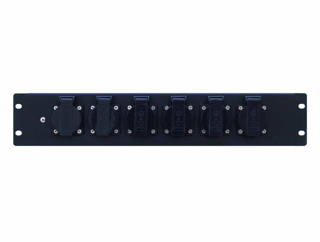 Stromverteilermodul für Rackeinbau · 6 Schutzkontaktsteckdosen (16 A) · Schwarze Stahlfrontplatte · Abmessungen (L x H) 483 x 88 mm (19", 2 HE)
