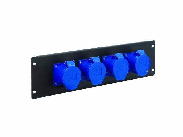 Stromverteilermodul für Rackeinbau · 4 CEE-Steckdosen (32 A, 3-polig) · Schwarze Stahlfrontplatte · Abmessungen (L x H) 483 x 132 mm (19", 3 HE)