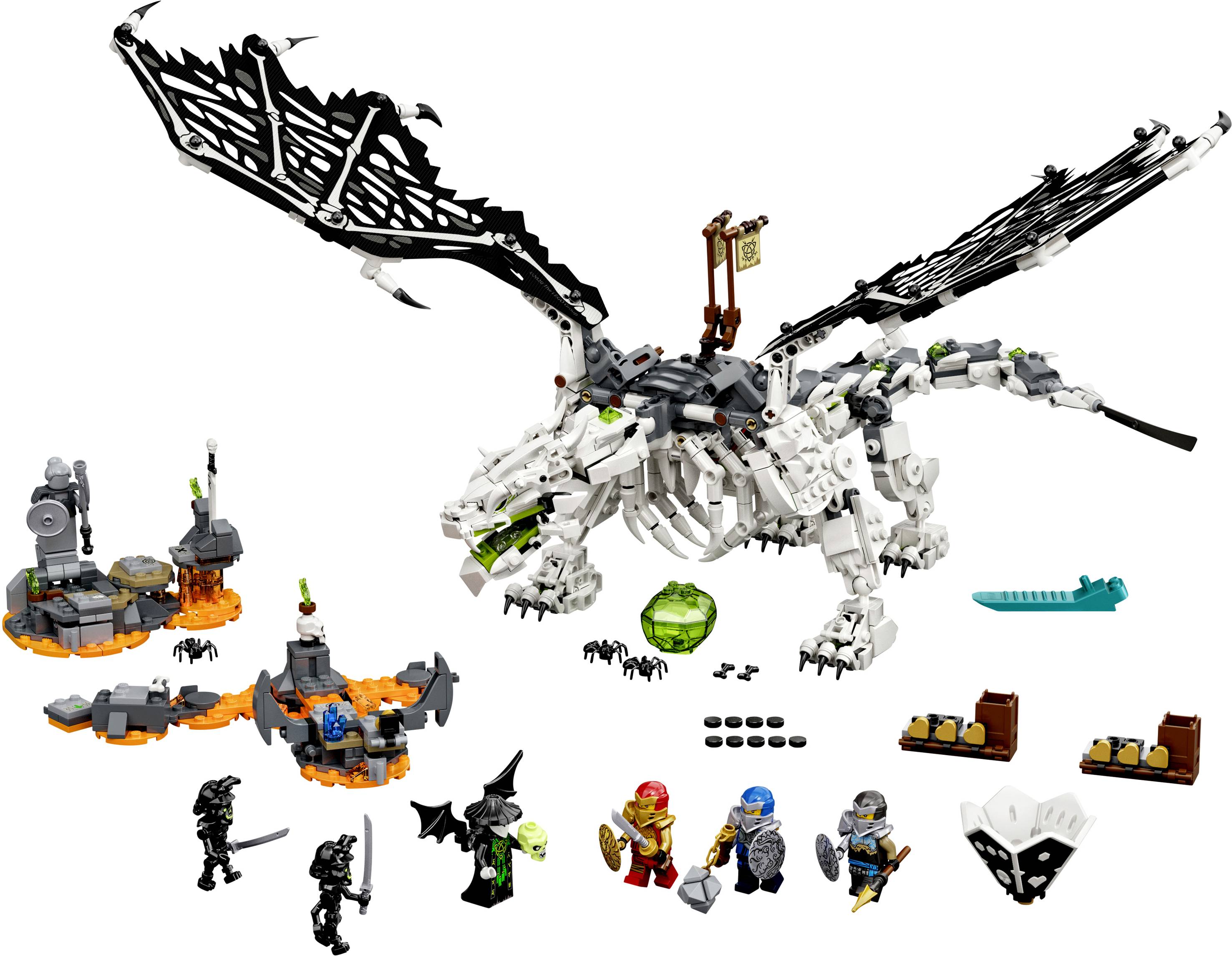 NINJAGO® Fans erleben mit dem Set „Drache des Totenkopfmagiers“ (71721) riesigen Bau- und Spielspaß. Dieses Drachen-Bauset enthält sechs Baufiguren, um ein packendes und kreatives Spielerlebnis zu ermöglichen. Kinder werden große Freude an den actionreichen Rollenspielen haben, wenn sich die Ninja dem Totenkopfmagier, seinem Drachen und seinen Skelett-Rittern entgegenstellen, um sich aus den schaurigen Verliesen von Shintaro zu befreien. Fantastisches Spielset für Brettspiel-Abenteuer Dieses Drachen-Bauset kann auch als LEGO® NINJAGO® Brettspiel benutzt werden, denn es enthält einen Würfel-Kreisel und einen Angriffsparcours mit Falle, den die Ninja bewältigen müssen. Kinder können den Würfel kreiseln lassen, um einen Weg durch das Spiel zu finden und sich die begehrte Elfenbeinklinge der Befreiung zu schnappen. Das Spielzeug lässt sich auch mit anderen LEGO® Sets kombinieren, um ein gewaltiges Brettspiel entstehen zu lassen. Atemberaubende Bausets für Kinder LEGO® NINJAGO® Sets lassen fantasievolle Kinder in eine geheimnisvolle Welt eintauchen, in der sie in die Rolle ihrer Ninja-Helden schlüpfen, sich eigene Geschichten ausdenken und sich den Kräften des Bösen entgegenstemmen. Verschiedene Drachen, Autos, Jets und andere Modelle ermöglichen Kindern unzählige unterhaltsame Rollenspiele.