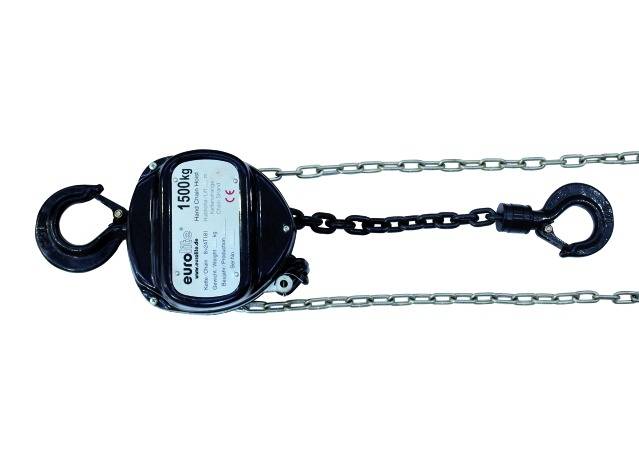 Flaschenkettenzug als Aufbauhilfe · Tragfähigkeit WLL 1500 kg · Kettenabmessung und Güteklasse 8 x 24 - T(8) · Hubhöhe 6 m · Inkl. Prüfzeugnis (beiliegend) · Wird regelmäßig bei einem akkreditierten Institut geprüft · Mit geschmiedeten Trag-Lasthaken (1,5 t)