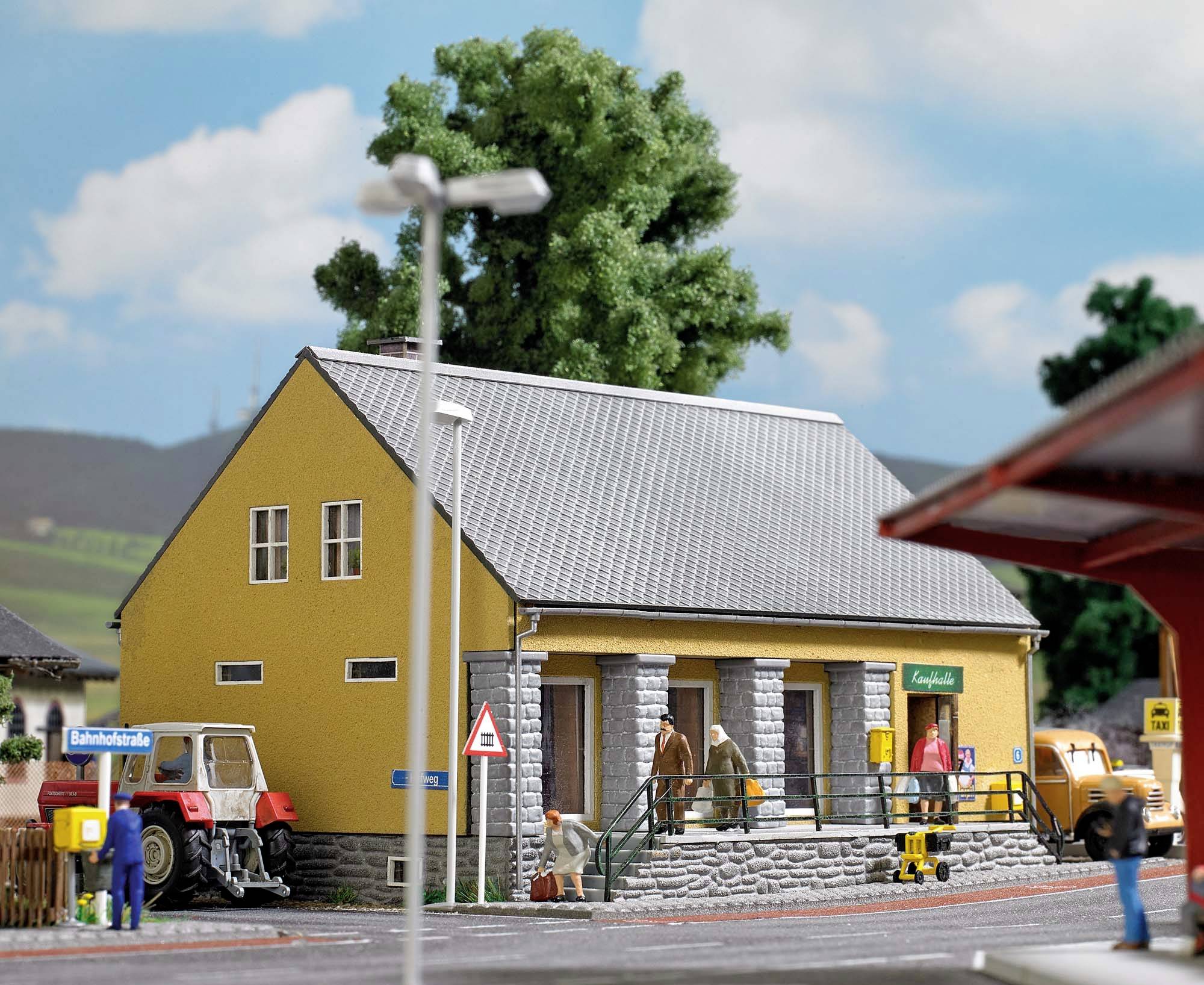 Typischer Landwarenhandel und »Konsum« aus den 1960er Jahren nach einem Vorbild aus der sächsischen Ortschaft Schleife. Bei diesem Modell besticht die realistische Oberfläche der verputzten Außenwände. Die großen Schaufenster können mit dem beiliegenden Ausschneidebogen originalgetreu dekoriert werden. Auf einer Stirnseite befindet sich ein Holztor mit Laderampe. Alle Teile fertig koloriert. Beleuchtbar mit Busch LEDs 5998. Bausatz.