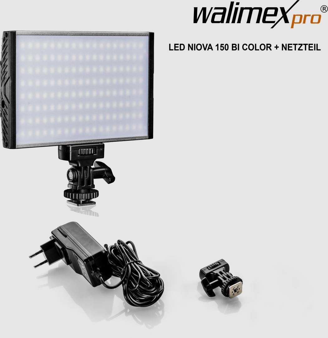 Set aus Walimex pro LED Niova 150 Bi Color + Netzteil Leuchte: Besonders helles und sehr hochwertiges On-Camera LED Foto- und Videolicht Bi Color Version, Farbtemperatur 3.200 – 5.600 K, 1.500 Lumen, CRI =95 Ra, 15 Watt, 10-100% dimmbar Robustes und hochwertiges Metallgehäuse, beleuchtetes Display, Betrieb mit einem Sony NP-F kompatiblen Akku (NP-F 550, NP-F 750 oder NP-F 960 und stärker) optional oder Netzteil Halterung mit Neigungsverstellung, Montage per Blitzschuh oder 1/4 Zoll Gewinde Netzteil: Input/Anschluss an das Stromnetz: Eurostecker AC 100 - 240 V / 50-60 Hz Ausgabeleistung: DC 15V 1A, Ausgangsformat: Rundstecker Länge Netzteil und Kabel: 4 Meter