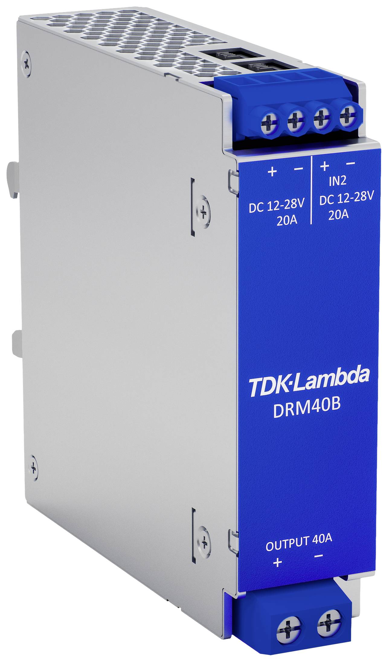 Die DRM40 Serie ist ein neues, sehr kompaktes Hutschienen-Modul zur Parallel- und Redundanzverschaltung zweier Stromversorgungen. Das Modul hat zwei 10 - 30Vdc-Eingänge mit jeweils 20A Nennstrom und einen Ausgang mit 40A Nennstrom. Der Ausgang kann für bis zu 4s mit 150% Nennlast bei kapazitiver wie induktiver Belastung betrieben werden. Der interne Rückspeiseschutz verursacht dank des Einsatzes von MOSFETs nur 200mV und reduziert damit den Spannungsverlust in den Modulen. Eine LED an der Gerätefront zeigt an, wenn beide Eingangsgeräte denselben Strom liefern und die Last somit gleichmäßig verteilt ist. Die Zulassungen beinhalten IEC/EN/UL60950-1, IEC/EN/UL62368-1, UL508 und