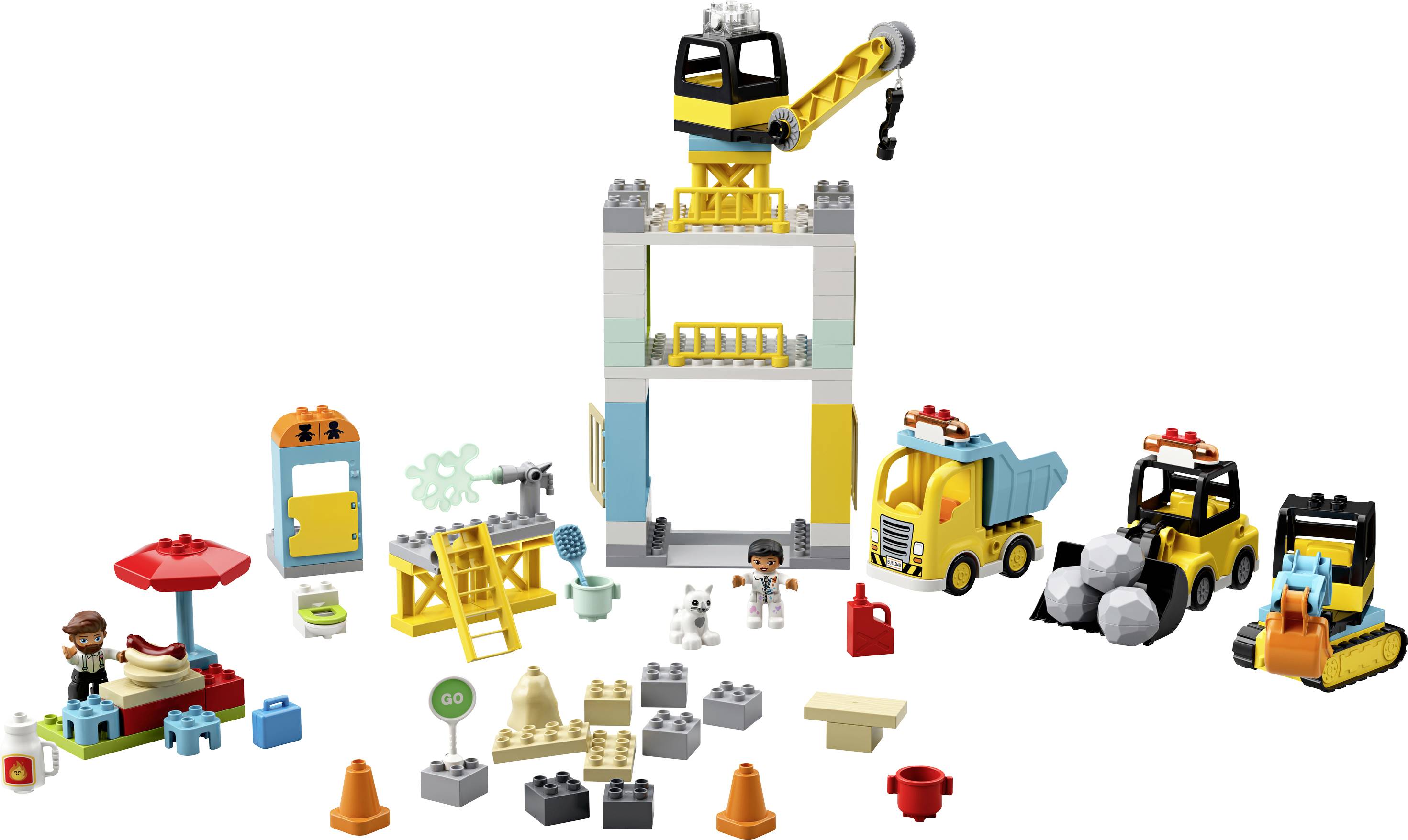 Das LEGO® DUPLO® Bau- und Spielset „Große Baustelle mit Licht und Ton“ (10933) bietet zahlreiche Fahrzeuge, Aktivitäten und Figuren, die Kleinkinder zu Rollenspielen inspirieren und ihre Entwicklung fördern. Eine große Spielzeug-Baustelle voller Spielmöglichkeiten Auf der betriebsamen Baustelle gibt es für kleine Bauarbeiter viel zu entdecken. Die möglichen Aktivitäten füllen locker einen ganzen Tag. Es gibt einen großen Bulldozer, einen Mini-Bulldozer, einen kleinen Radlader, einen Kipplaster und einen Kran, um Kleinkinder und Eltern gemeinsam Baustoffe anliefern, einen Turm bauen und Schutt von der Straße räumen zu lassen. Und mittags gibt es auf der Baustelle eine Stärkung am Hotdogstand! Vielseitiges Set voller Funktionen 5 Figuren in modernen Outfits – eine Malerin und eine Kranführerin, 2 Bauarbeiter und ein Hotdogverkäufer – und jede Menge coole Funktionen, zum Beispiel Licht- und Ton-Steine sowie der Push-and-Go-Rückziehmotor am Bulldozer, beschäftigen und inspirieren junge Kinder. Das Set lässt sich mit anderen LEGO® DUPLO® Bau- und Spielsets kombinieren, um noch weitere entwicklungsfördernde Spielerlebnisse zu vermitteln.
