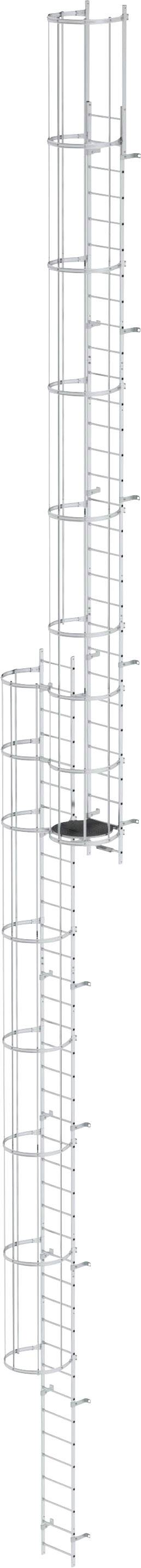 Einsatzbereich An Gebäuden für Wartungs- und Reinigungsarbeiten. Für Schornsteine gelten bzgl. Befestigung und Rückenschutz besondere Vorschriften. Unabhängig von der Steighöhe gilt: Als Absturzsicherung kann entweder Rückenschutz oder Steigschutz verwendet werden (Kombination nicht erlaubt, da die Rettung von Personen durch den Rückenschutz behindert wird) Arbeitsmedizinische Untersuchung zur Höhentauglichkeit (z. B. G 41), die Notwendigkeit hängt von der Gefährdungsbeurteilung (u. a. Personenkreis, Gesamtsteighöhe) der jeweiligen Steigleiteranlagen ab Ein Nachweis für die Tragfähigkeit des Untergrunds muss für jedes Bauvorhaben durch einen verantwortlichen Sachverständigen für Standsicherheit geprüft und abgenommen werden Durchgangssperre (Sicherungstüre) empfehlenswert. Liegt die Ausstiegsstelle an Verkehrswegen oder Arbeitsplätzen, wird eine Durchgangssperre benötigt Die senkrechte Überschneidung von aufeinanderfolgenden Leiterzügen muss mindestens 1.680 mm betragen An ungesicherten Ausstiegsstellen sind beidseitig zur Steigleiter angebrachte oder in die Ausstiegsebene geführte Geländer erforderlich Spalt beim Austritt darf nicht größer als 75 mm sein Antrittsmaß: Abstand Einstiegsebene bis zur ersten Sprosse 100 – 400 mm. Beim Ausstieg nach vorne muss die oberste Sprosse auf der Höhe der Ausstiegsebene liegen Bei Steigleitern mit Steigschutz muss bei Durchstiegen der Freifläche vor der Leiter mindestens 800 x 800 mm betragen. Bei Neuanlagen im Bestand sollten diese Maße ebenfalls eingehalten werden Die Spaltmaße zwischen Steigleiteranlage und Geländer dürfen maximal 120 mm betragen Die Verbindung zum Steigschutz muss von einem gesicherten Standplatz aus herzustellen und zu lösen sein. Ein gesicherter Standplatz ist z. B. ein Podest mit Geländer und einem gesicherten Zugang Für ein sicheres Umgreifen der Seitenholme muss der Freiraum zu angrenzenden Teilen um die Seitenholme herum mindestens 75 mm betragen (mit Ausnahme von Bauteilen die zur Steigleiteranlage gehören)