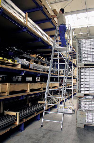 Plattformleiter aus Aluminium Stabile Rechteckrohr-Holme 80 mm tiefe, geriffelte Stufen Große, rutschfeste Arbeitsplattform (650 x 600 mm) 4-fach gebördelte Sprossen-/Holmverbindung Mit beidseitigem Handlauf, 3-seitigem Geländer, Knieleiste und Sicherungsseil für sicheres Begehen und Stehen Stützteil mit schmalem Fahrwerk und Ballastgewicht für hohe Standsicherheit Besonders für den Einsatz in engen Regalgängen o.ä. geeignet Integrierte Bockrollen Ø 125 mm mit Feststeller für einen schnellen Standortwechsel im ausgeklapptem Zustand nivello®-Leiterschuhe mit patentierter 2-Achsen-Neigungstechnik Großzügige Werkzeugablage Dank stabiler Stahl-Scharniere platzsparend zusammenklappbar Leiterbreite: 650 mm (ohne Traverse) Stufenabstand: 235 mm Leiterneigung: 70°