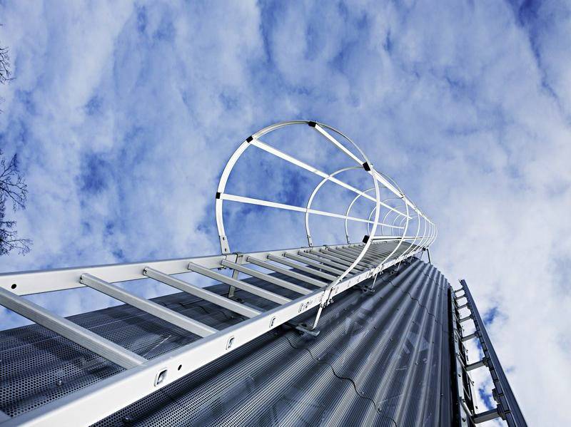 Einsatzbereich An Gebäuden für Wartungs- und Reinigungsarbeiten. Für Schornsteine gelten bzgl. Befestigung und Rückenschutz besondere Vorschriften. Unabhängig von der Steighöhe gilt: Als Absturzsicherung kann entweder Rückenschutz oder Steigschutz verwendet werden (Kombination nicht erlaubt, da die Rettung von Personen durch den Rückenschutz behindert wird) Arbeitsmedizinische Untersuchung zur Höhentauglichkeit (z. B. G 41), die Notwendigkeit hängt von der Gefährdungsbeurteilung (u. a. Personenkreis, Gesamtsteighöhe) der jeweiligen Steigleiteranlagen ab Ein Nachweis für die Tragfähigkeit des Untergrunds muss für jedes Bauvorhaben durch einen verantwortlichen Sachverständigen für Standsicherheit geprüft und abgenommen werden Durchgangssperre (Sicherungstüre) empfehlenswert. Liegt die Ausstiegsstelle an Verkehrswegen oder Arbeitsplätzen, wird eine Durchgangssperre benötigt Die senkrechte Überschneidung von aufeinanderfolgenden Leiterzügen muss mindestens 1.680 mm betragen An ungesicherten Ausstiegsstellen sind beidseitig zur Steigleiter angebrachte oder in die Ausstiegsebene geführte Geländer erforderlich Spalt beim Austritt darf nicht größer als 75 mm sein Antrittsmaß: Abstand Einstiegsebene bis zur ersten Sprosse 100 – 400 mm. Beim Ausstieg nach vorne muss die oberste Sprosse auf der Höhe der Ausstiegsebene liegen Bei Steigleitern mit Steigschutz muss bei Durchstiegen der Freifläche vor der Leiter mindestens 800 x 800 mm betragen. Bei Neuanlagen im Bestand sollten diese Maße ebenfalls eingehalten werden Die Spaltmaße zwischen Steigleiteranlage und Geländer dürfen maximal 120 mm betragen Die Verbindung zum Steigschutz muss von einem gesicherten Standplatz aus herzustellen und zu lösen sein. Ein gesicherter Standplatz ist z. B. ein Podest mit Geländer und einem gesicherten Zugang Für ein sicheres Umgreifen der Seitenholme muss der Freiraum zu angrenzenden Teilen um die Seitenholme herum mindestens 75 mm betragen (mit Ausnahme von Bauteilen die zur Steigleiteranlage gehören)