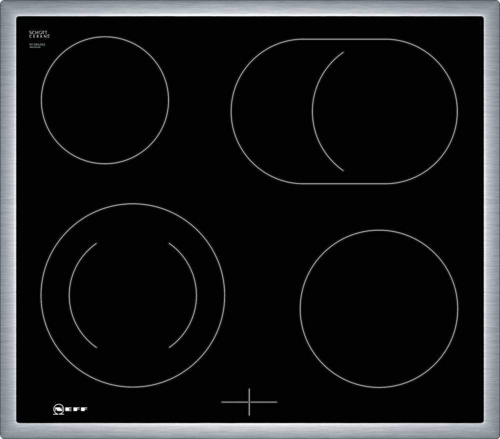 60 cm: Platz für 4 Töpfe oder Pfannen Flexibilität der Kochzonen Bräterzone: Extra zuschaltbare Kochzone für großes Bratgeschirr Zweikreis-Kochzone: Verwenden Sie normales oder größeres Kochgeschirr für die erweiterbare Kochzone. Kochzone vorne links: 210 mm, 145 mm, 1 kW Kochzone hinten links: 145 mm, 1.2 kW Kochzone hinten rechts: 265 mm, 170 mm, 1.6 kW Kochzone vorne rechts: 180 mm, 2 kW Benutzerfreundlichkeit im Herd: Steuern Sie die Leistung der Kochstelle mit den Knebeln am Herd. Design Rahmen in Edelstahl Sicherheit Restwärmeanzeige je Kochzone: zeigt an, welche Kochzonen noch heiß sind. Installation Maße des Gerätes (HxBxT mm): 43 x 583 x 513 Erforderliche Nischengröße (HxBxT mm): 43 x 560 x (490 - 500) Minimale Arbeitsplattenstärke: 16 mm Gesamtanschlusswert: 7800 W