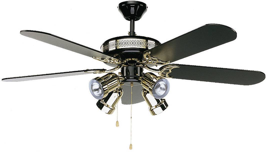 CasaFan® BLACK MAGIC 132, Deckenventilator mit Beleuchtung , Gehäuse Lack schwarz/ Messing ploliert, 5 Flügel Lack schwarz, Ø 132 cm, inkl. 4-Strahler-Leuchte Messing poliert, max. 4 x 60 W, E27, Motor max. 56 Watt, 3-Stufen-Zugschalter, Vor-/Rückwärtslauf über Schiebeschalter, gewuchteter Motor, 230 V ~ 50 Hz, ruhiger Lauf, hochwertige Kugellager, Leuchtenzugschalter 0-2-2-4, Abstand Flügel - Decke 280/210 mm, Flügel ohne Rattaneinlage, auch für Schrägen bis 38° geeignet, besonders flach bei Montage ohne Deckenstange, Zubehör wie Flügel in anderen Dekoren, längere Deckenstangen für hohe Räume oder Schrägen, Fernbedienungen, andere Anbauleuchten oder Wandschalter verfügbar.