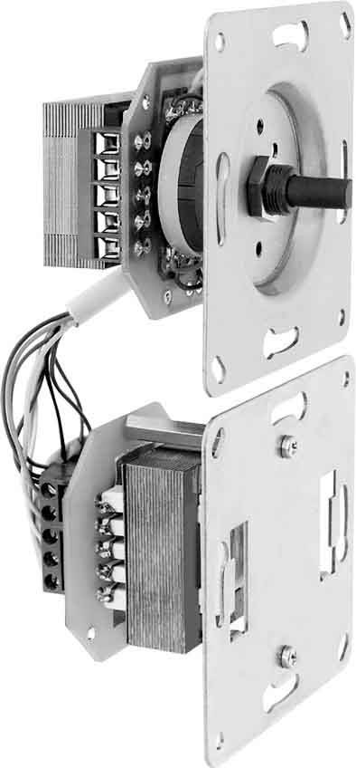 100 V-Lautstärkesteller für JUNG-Schalterprogramme, geeignet für z. B. Büros, Restaurants, Kaufhäuser etc., bestückt mit einem durchdrehbaren Drehschalter (mit 9 Lautstärkestufen und 3 Nullstellungen) und zwei 50 W-Sparübertragern, Nennleistung: 100 W