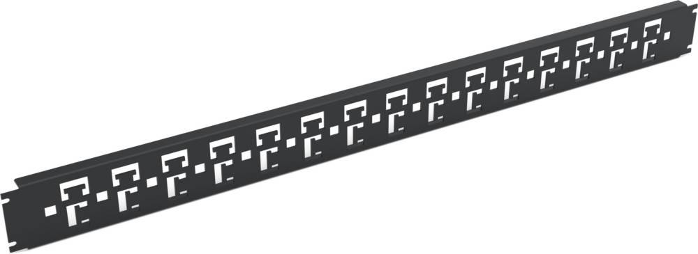 Kabelabfangschiene für 800mm Schrankbreiten zur Montage in IT- (F1) und Serverschränken (S1) sowie in Grundgestellen (Fo1, So1), horizontale Montage über die gesamte Schrankbreite, Befestigung direkt an den Eckprofilen des Schrankes, für Kabelbinder und Löcher für Käfigmuttern, Oberflächenbehandlung: Strukturlack Enoc System Schwarz RAL 9005