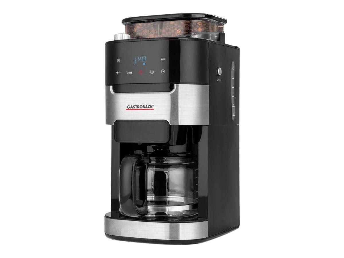 Gastroback 42711 Kaffeeautomat Grind&Brew Pro 12 Tassen 900Watt Edelstahl/schwarz. Produkttyp: Filterkaffeemaschine, Kaffeezubereitungstyp: Halbautomatisch, Fassungsvermögen Wassertank: 1,5 l, Kaffee-Einfüllart: Kaffeebohnen, Gemahlener Kaffee, Behälter für gebrühten Kaffee: Karaffe, Kapazität (in Tassen): 12 Tassen, Eingebautes Mahlwerk. Display-Typ: LCD. Leistung: 900 W. Produktfarbe: Schwarz, Edelstahl