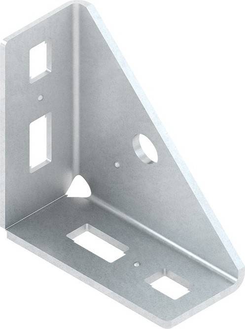 Winkelverbinder, gleichschenklig und einseitig geschlossen, zur Verbindung von vertikal zueinander stehenden T-förmig zulaufenden U-Profilen, Ankerschienen/Profilschienen oder zur Verwendung als Knotenwinkel für Abhängesysteme, Befestigungszubehör muss, je nach Anwendungsfall, gesondert bestellt werden. Verwendung für : Profil U 5050/... Profil U 6040/... Ankerschienen/Profilschienen 29.../... Abmessungen (ca. Maße) Schenkellänge : 100 x 100 mm Schenkelbreite : 46 mm Materialstärke t : 4 mm Bef. Lochung je Schenkel : 13 x 18 mm und 13 x 26 mm mittiger Abstand : 42 mm winkelhalbierende Lochung, geschl. Seite : Ø 14 mm Abstand von der offenen Kante : 15 mm Werkstoff : Stahl, tauchfeuerverzinkt nach DIN EN ISO 1461