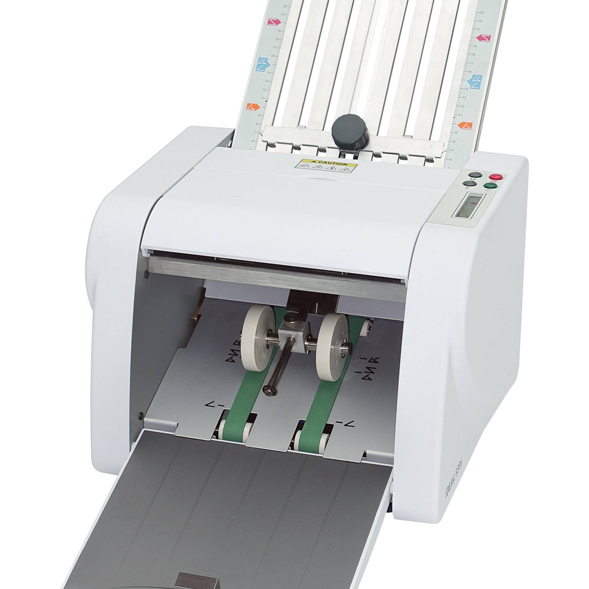 Kompakte Büro-Falzmaschine mit vier Falzarten und Bandauslage. Ausklappbarer Zuführtisch für 150 Blatt Papier. Falzgeschwindigkeit. Einfache Einstellung der Falzarten über Symbole und Farbcodes. Abschaltautomatik mit Displayanzeige beim Aufklappen von Gehäuseteilen. Automatische-Endabschaltung. Einfache Bedienung über Start-/Stoppschalter. Display mit Fehleranzeigen. Zähler für Addition (Totalzähler) oder Subtraktion (Vorwahlzähler). Bandauslage mit verstellbarer Papierauswurfrolle zur kontrollierten Ablage des gefalzten Papiers.
